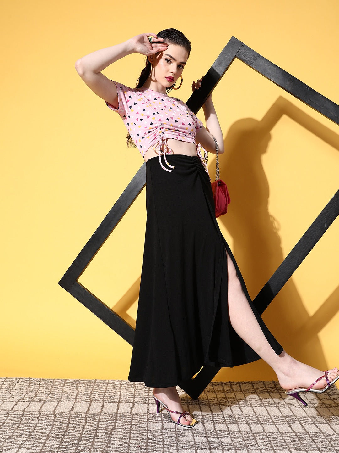 Augment your fashion aesthetic this summer by opting for this cute Pink & Black Geometric Print Round Neck Waist Tie-Up Cotton Ruched Crop Top from Berrylush. Designed from a premium quality cotton fabric to provide a soft touch and uninterrupted comfort to your body all day long. Highlighting fitted style that lends this top a curve-hugging silhouette that gracefully defines your feminine figure. The round neck design gives your neckline a clean and modish appeal. You can complete your weekend outing look by pairing this crop top with a maxi-length skirt, your favorite earrings, and a stunning side bag.
