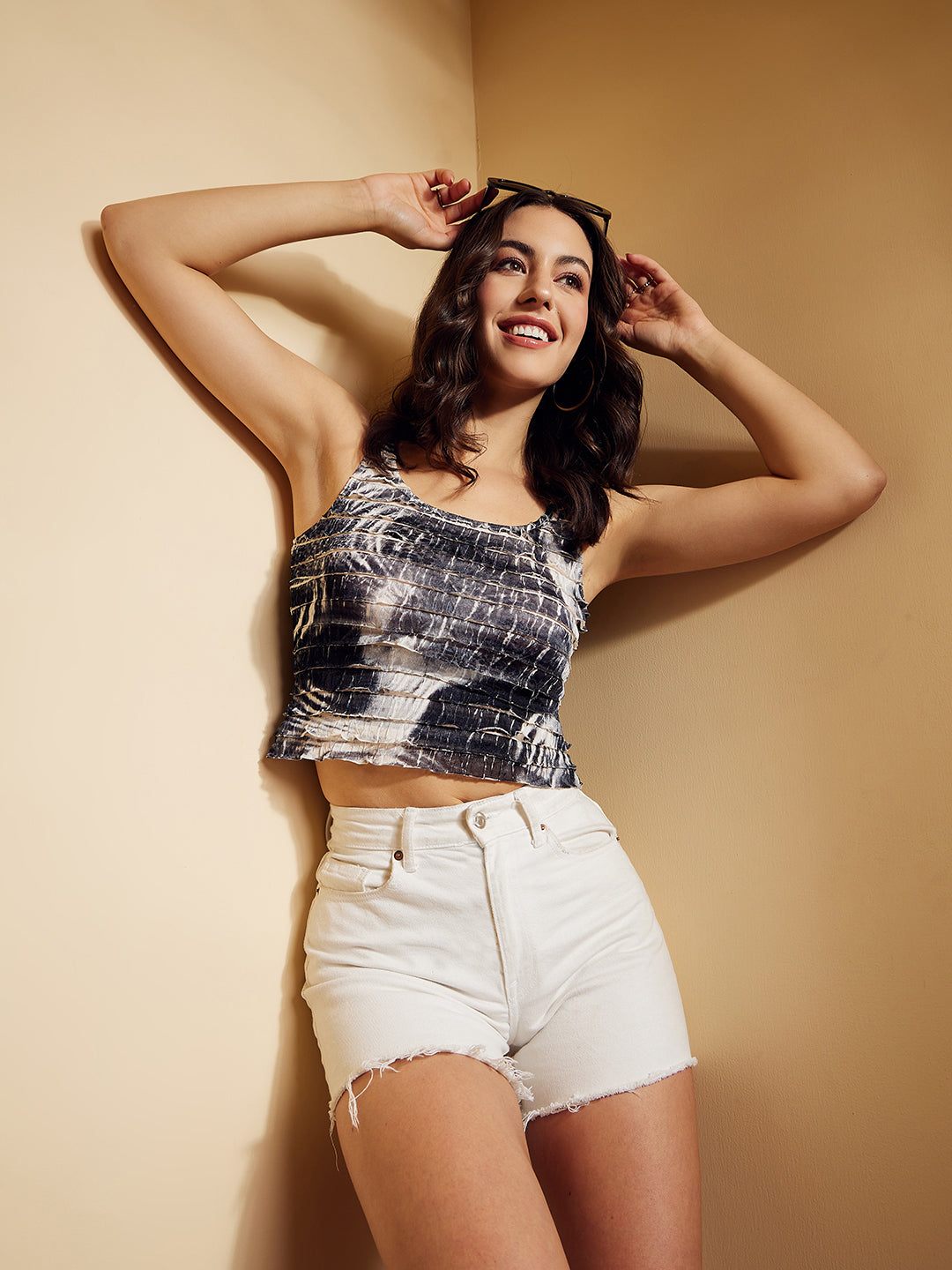 Exude fierce spirit by magnifying your capsule closet with bold signature style with this cinematic Black & White Tie-Dye Printed Scoop Neck Sleeveless Viscose Cropped Tank T-Shirt designed by Berrylush for its latest casual wear collection. Comes with a black and white tie-dye print that gives this t-shirt a bold appearance and a fierce aura. Fashioned with a scoop neck design that gives your neckline a smart and refined look without exposing much skin. Detailed with a sleeveless design that keeps your arms cool all day long with layering options as per your convenience. Enjoy the weekend in style by pairing this crop tank t-shirt with a denim mini skirt, white sneakers, matching earrings, and a sassy side bag.