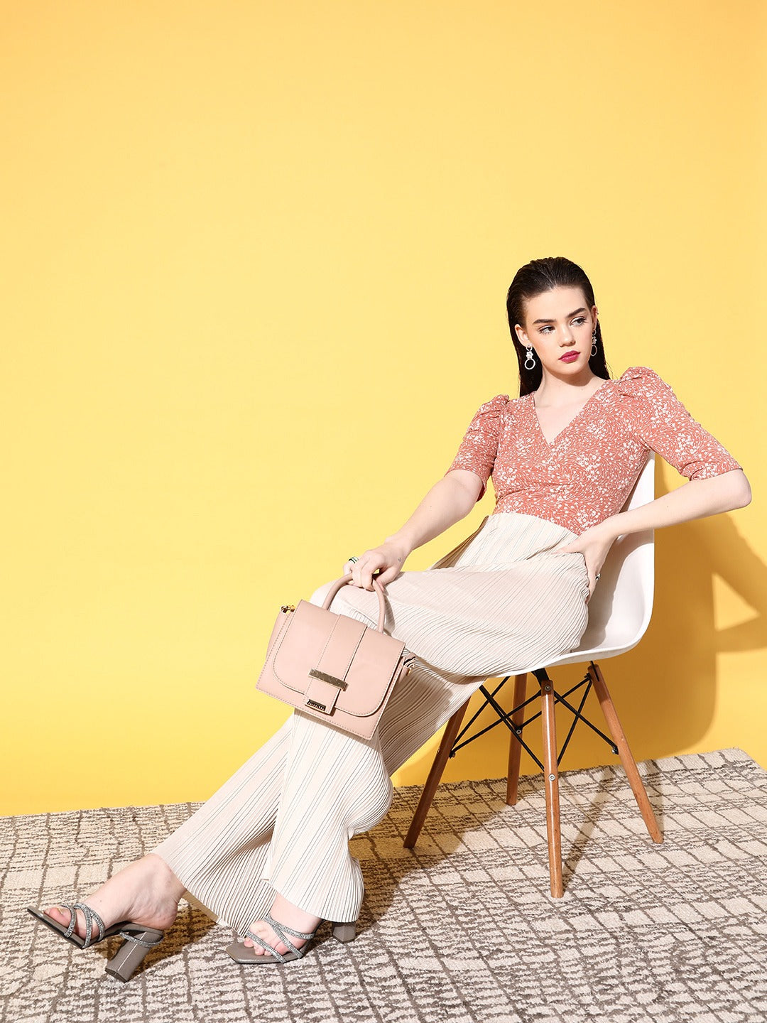 Refine your athleisure and off-to-duty style with this cute Rust Brown & Off-White Floral Printed V-Neck Cotton Pleated Regular Wrap Top from the latest floral print collection of Berrylush. This top is a cotton creation that flaunts amazing lightweight features and outstanding moisture-absorbing properties. Styled in regular length that makes this top is a perfect clothing option for most casual occasions. Fashioned with pleated surface styling that lends this top a voluminous look with an ornamental finish. Make your presence remarkable by wearing this wrap top with a pair of formal trousers, classic earrings, and a pink handbag.