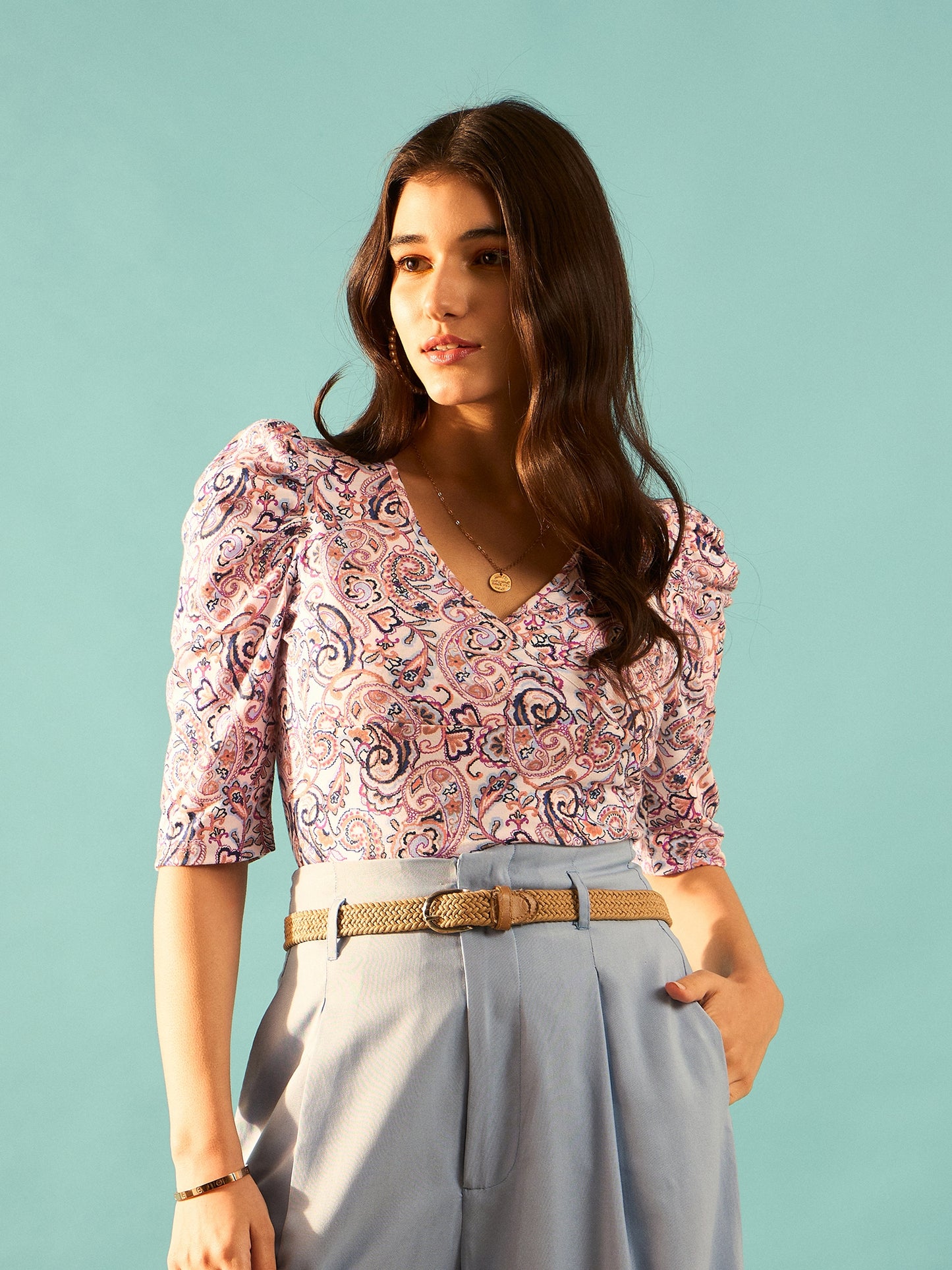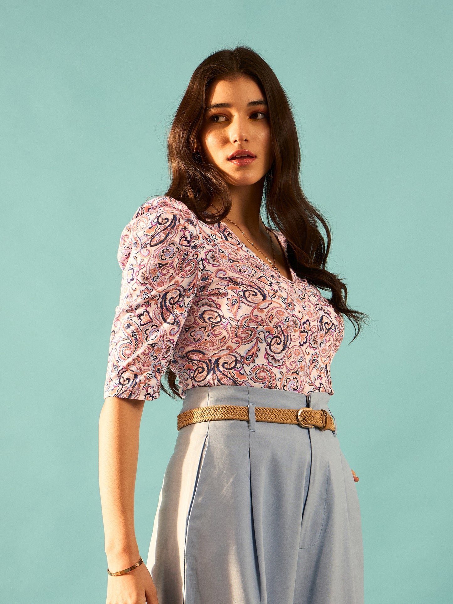 - Short-puff sleeves lend this top a trendy and effortless style