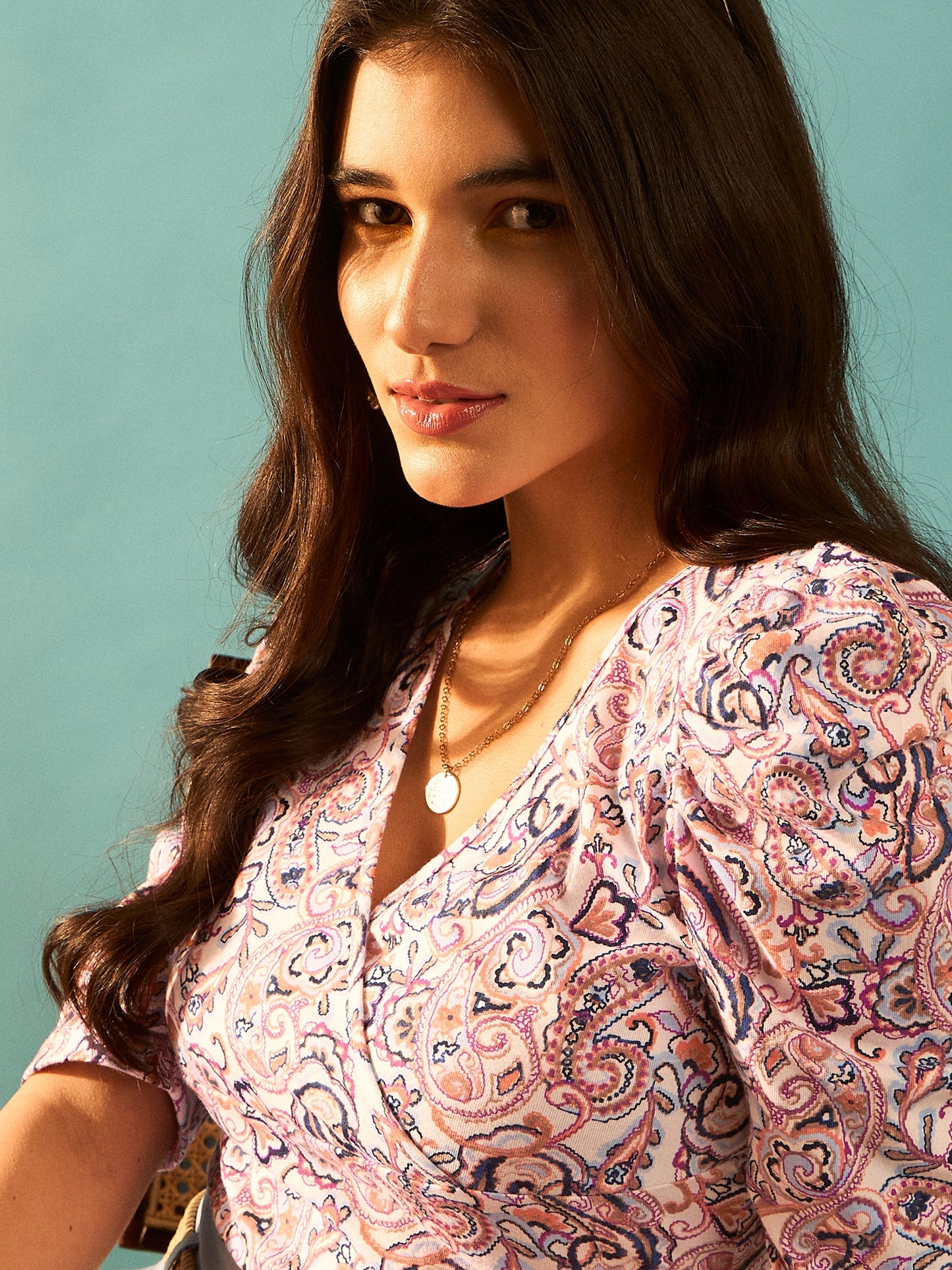 Introducing the Berrylush Tribal Printed Wrap Top — where comfort meets boho chic. This irresistible regular-length top, crafted from soft knitted cotton, features a vibrant white and orange tribal print that captures the essence of summer. The flattering V-neck and neatly pleated surface add a touch of sophistication to your casual look. Short puffed sleeves provide airy comfort on warmer days, while maintaining an elegant silhouette. Perfect for any casual occasion, this opaque wrap top blends functionality with playful style to enhance your wardrobe effortlessly.