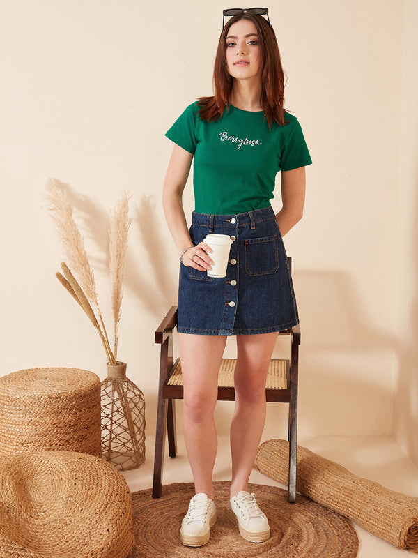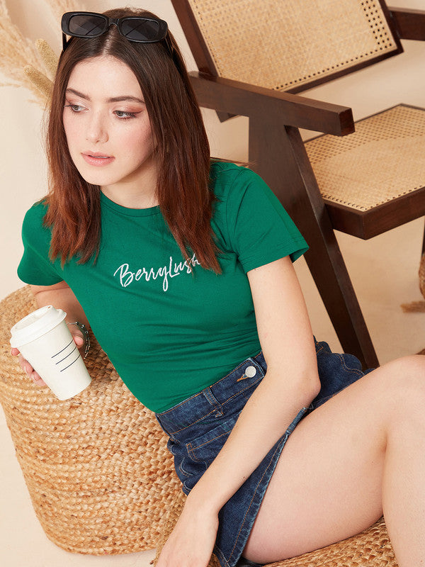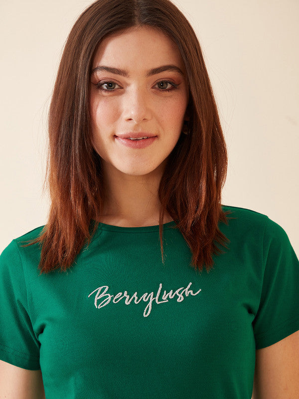 Berrylush Women Solid Green Round Neck Short Sleeves Logo Embroidered Regular T-Shirt