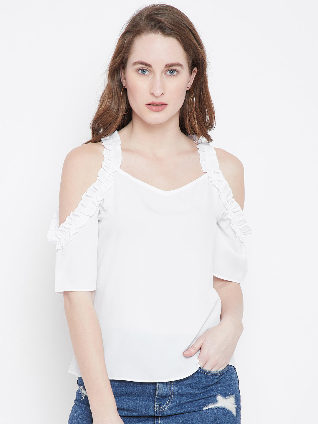 Berrylush Women Solid White V-Neck Cold-Shoulder Sleeves Pleated A-Line Regular Top