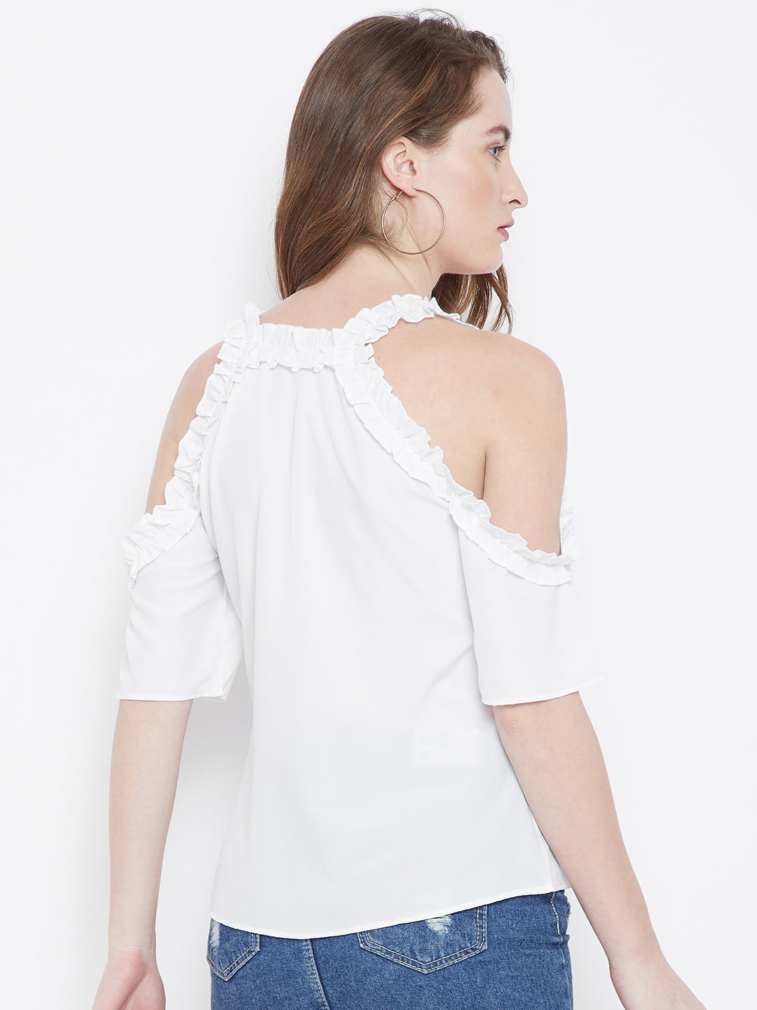 Show off your unique fashion sense with this chic Solid White V-Neck Cold-Shoulder Sleeves Pleated A-Line Regular Top from the summer collection launched by Berrylush. The three-quarter sleeves complemented with cold-shoulder styling is the most admired element of this top as they give a dramatic and alluring appearance to your shoulders and arms along with a ventilation feature. Moreover, the A-line shape of the top offers an elegant definition to your natural curve with a compressive silhouette while the pleated surface styling adds feminine charm to the top. Complete your outing look by pairing up this dazzling white A-line top with a pair of faded jeans, block heels, and a trendy side bag to get a sophisticated look.