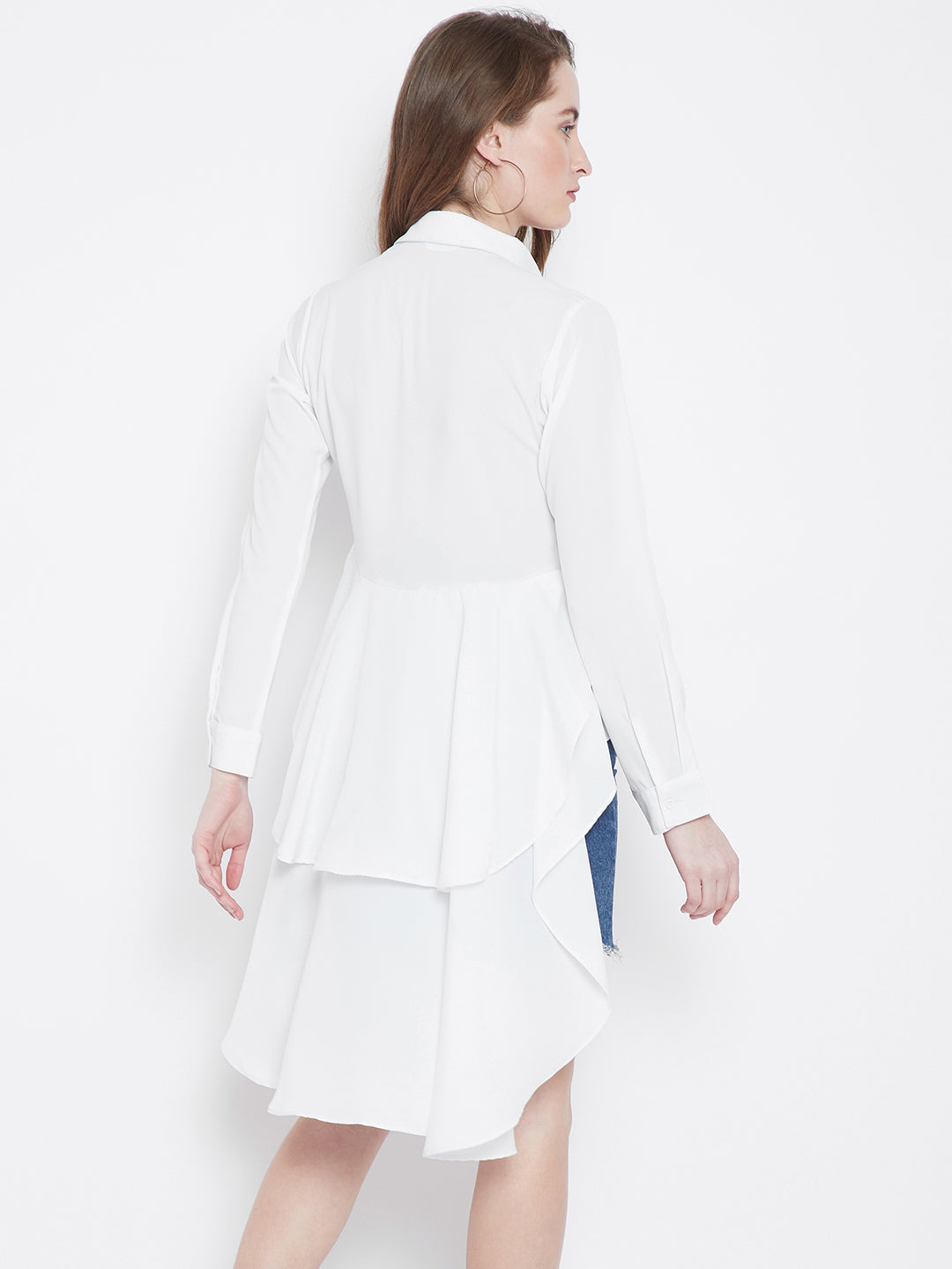 Berrylush Women Solid White Collared Neck Button-Up Longline Shirt Style Top