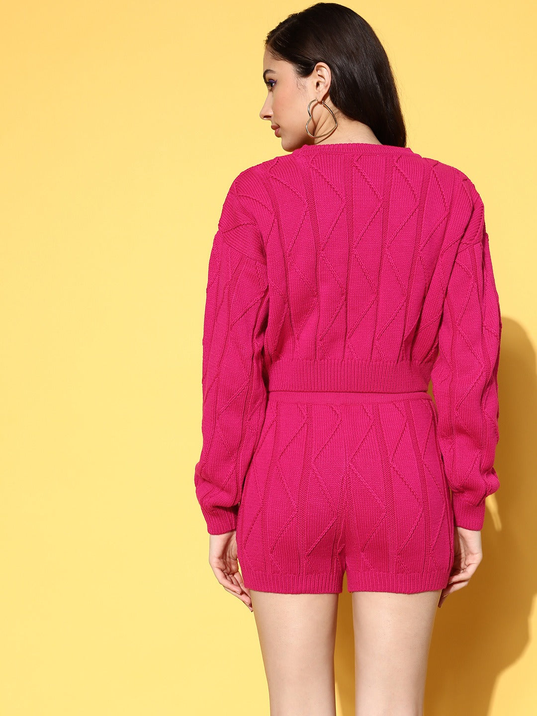 Berrylush Women Solid Pink Round Neck Acrylic Slip-On Knitted Top & Shorts Co-Ord Set