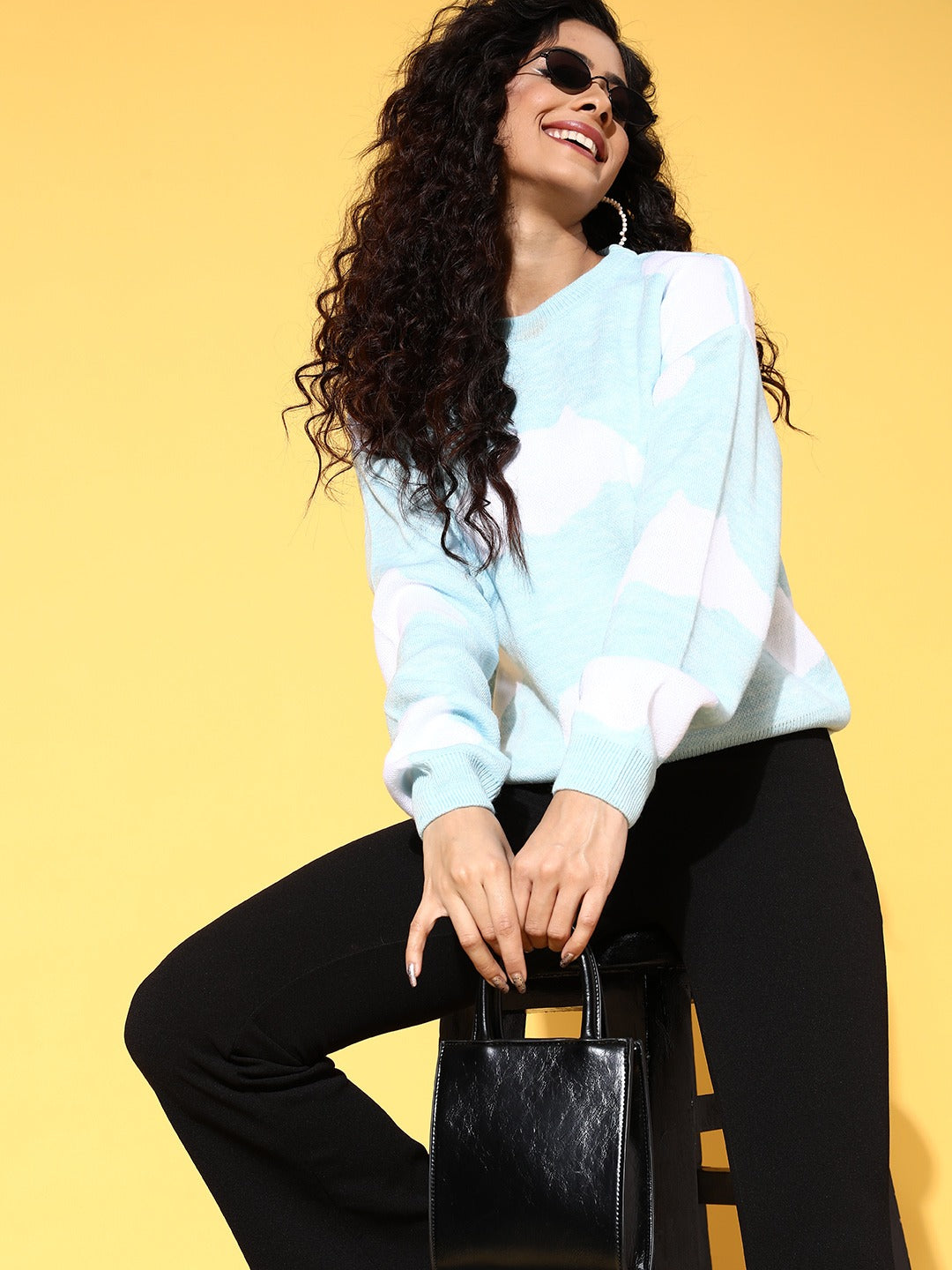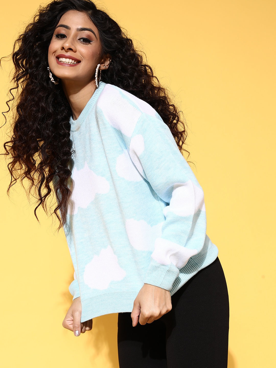 Berrylush Women Blue & White Cloud Printed Round Neck Acrylic Ribbed Pullover Sweater