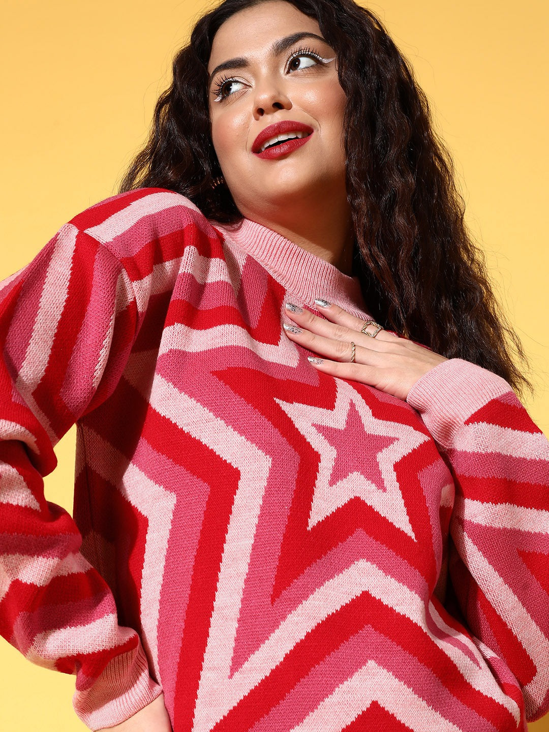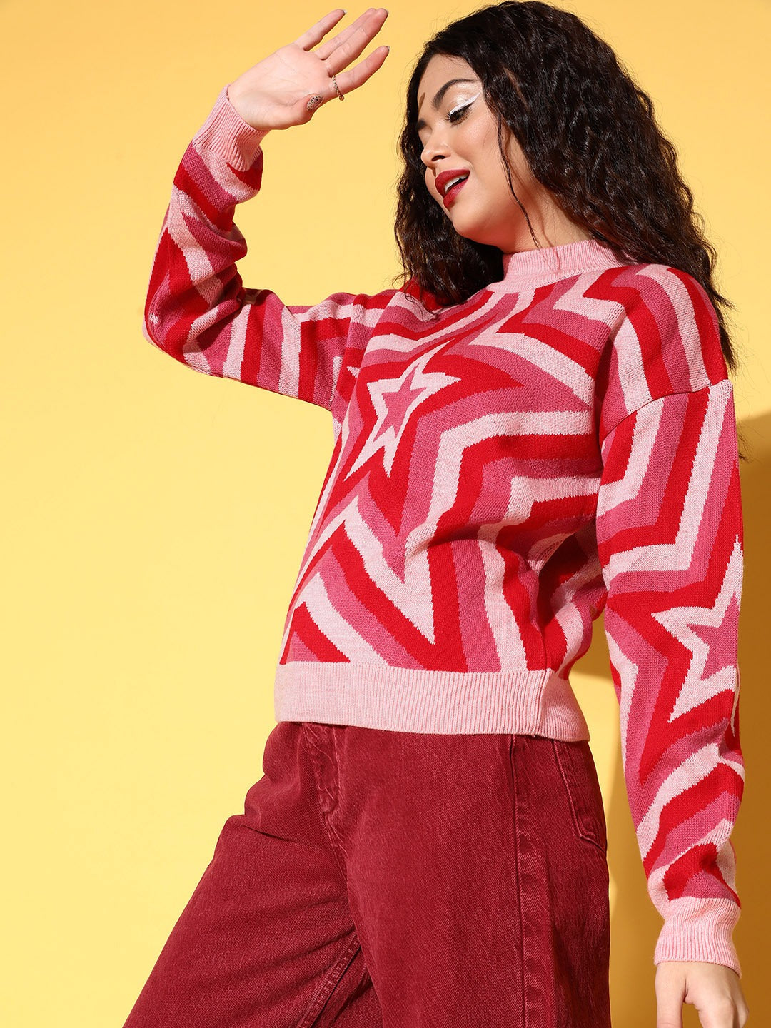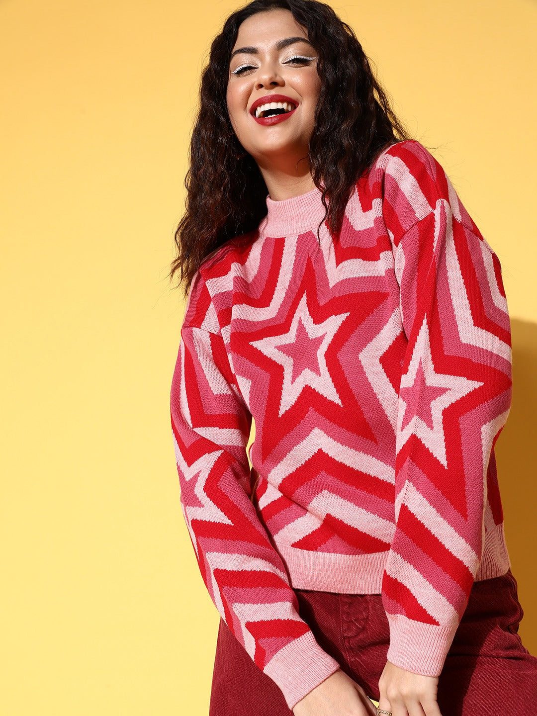 Berrylush Women Pink Star Printed Round Neck Acrylic Ribbed Pullover Sweater