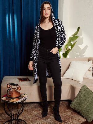 Berrylush Women Black & White Geometric Printed Hood Neck Drop-Shoulder Sleeves Open-Front Ribbed Hem Longline Cardigan