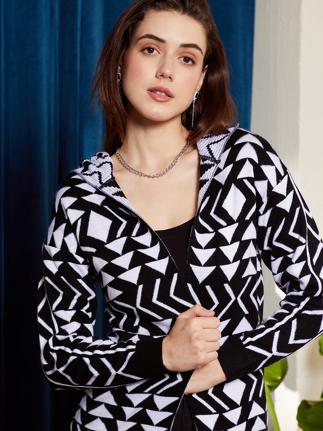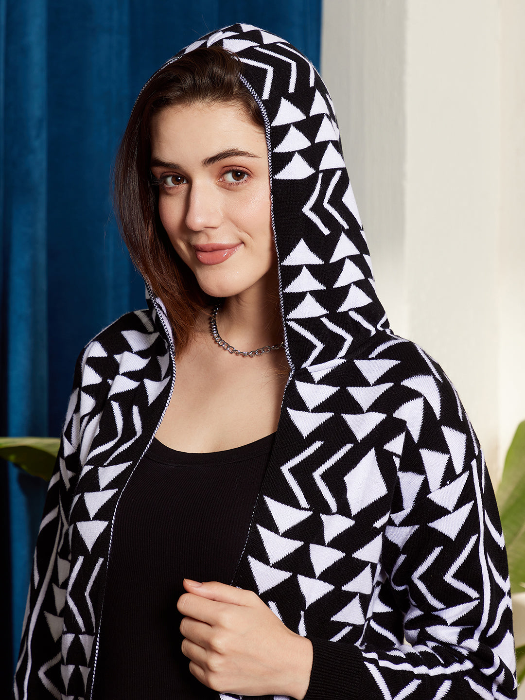 Drape yourself in the epitome of comfort and style with Berrylush's Black & White Geometric Printed Longline Cardigan. Perfect for those casual outings where making a subtle statement is key, this acrylic-knitted masterpiece offers warmth without sacrificing fashion. Its hood neckline and drop-shoulder sleeves add a modern twist to the classic cardigan design, while the open front design ensures ease of wear. The geometric print stands out against any backdrop, making it an unforgettable piece in your wardrobe. Finished with a ribbed hemline that accentuates its longline silhouette—this opaque cardigan is your go-to layering essential for any season.