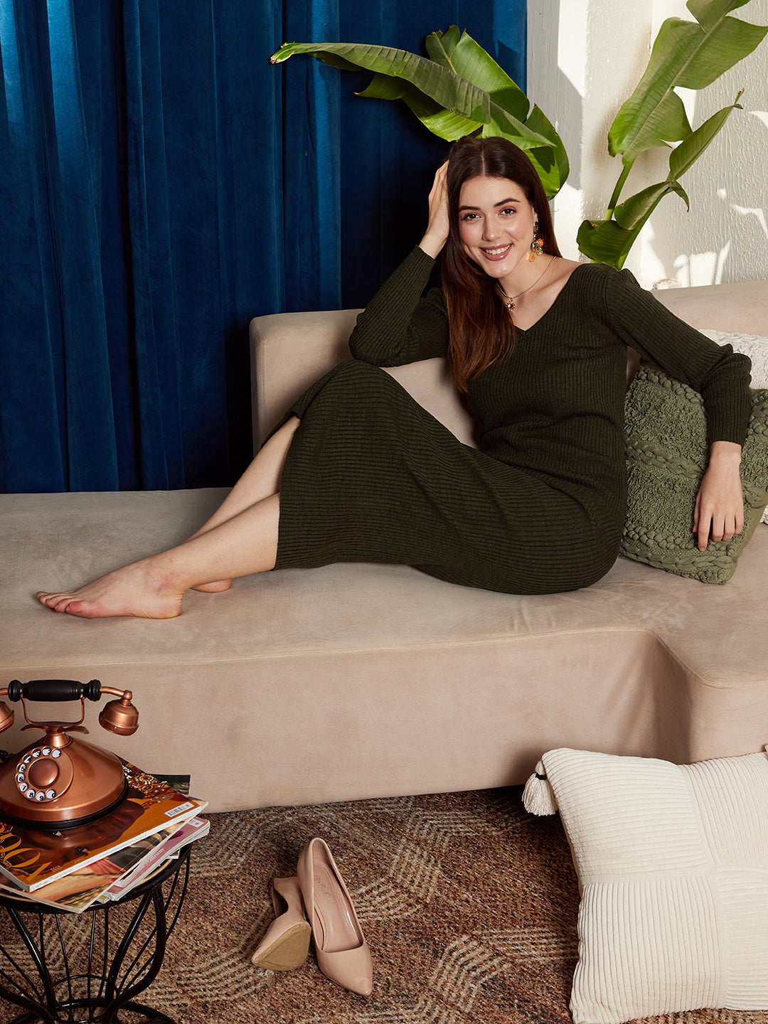 Berrylush Women Solid Green V-Neck Acrylic Long Sleeves Straight Hem Knitted Bodycon Midi Sweater Dress