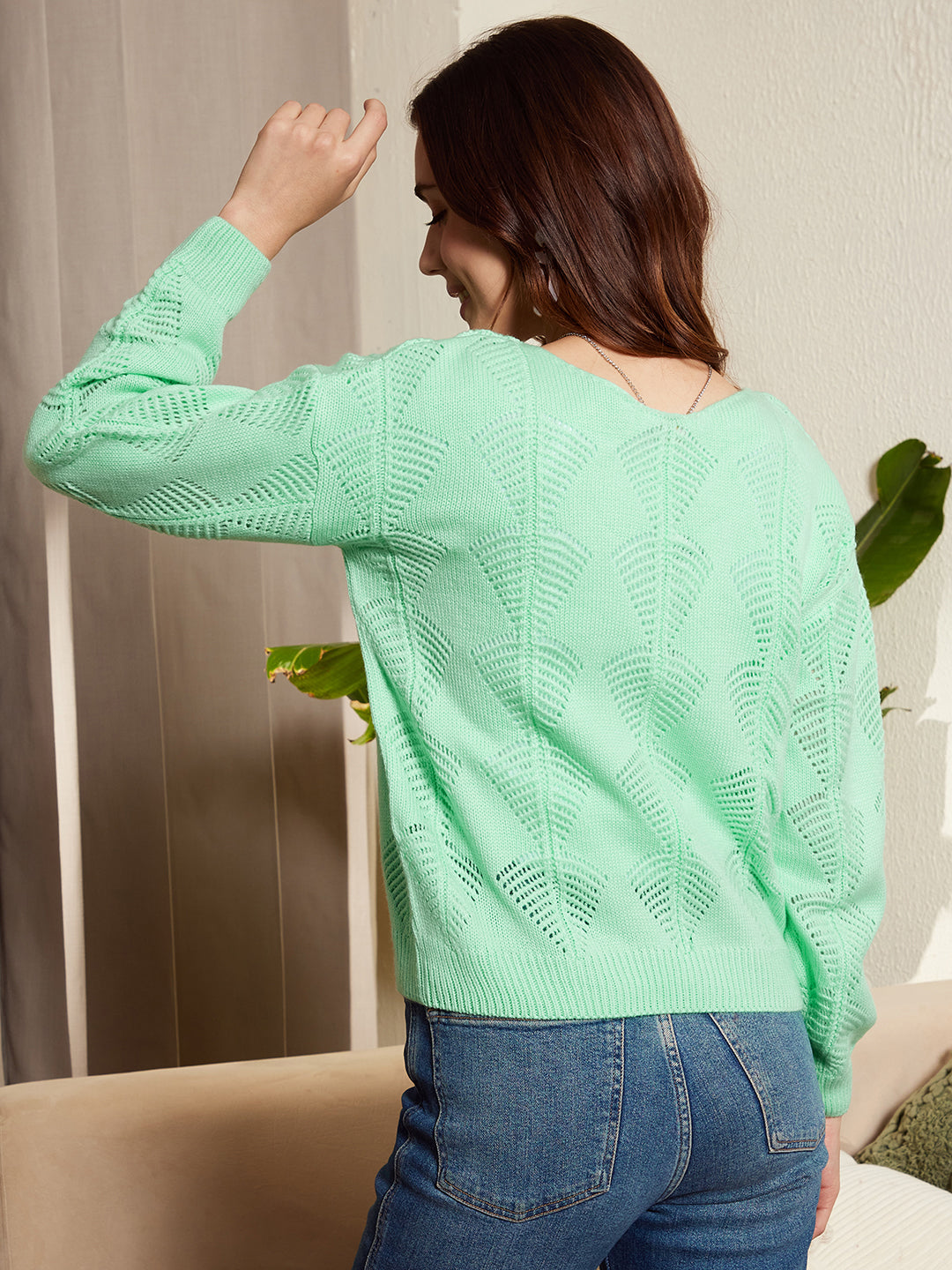 Berrylush Women Solid Light Green V-Neck Drop-Shoulder Sleeves Ribbed Hem Pointelle Knitted Regular Sweater