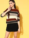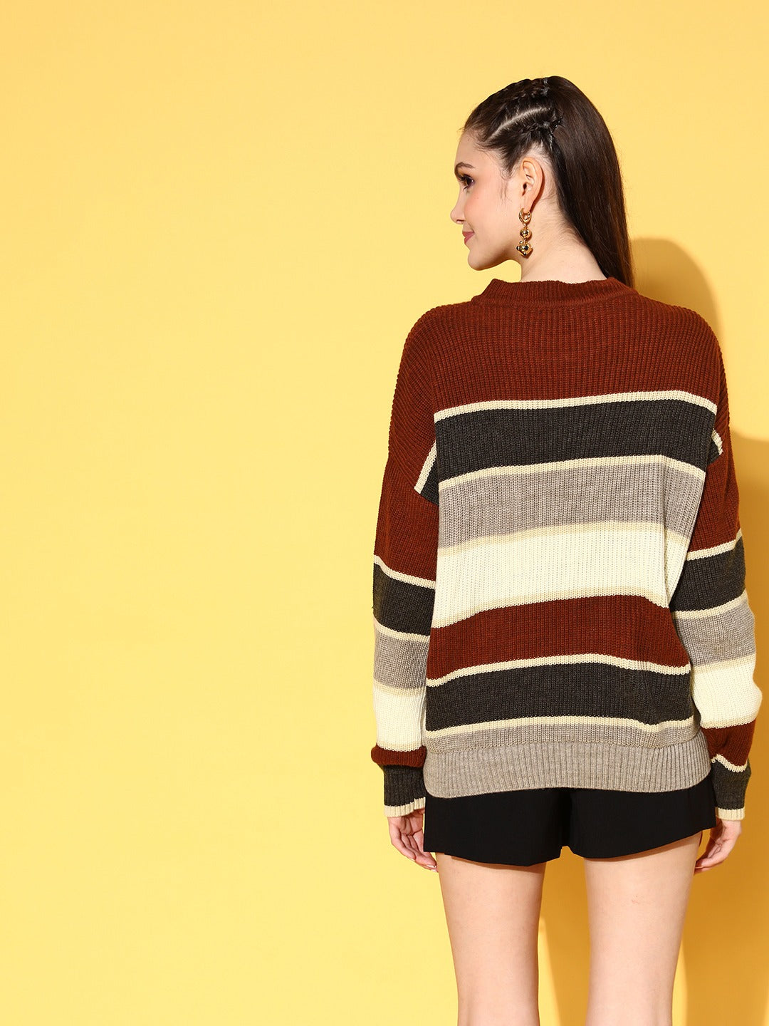 Berrylush Women Brown & Maroon Striped Print Round Neck Acrylic Ribbed Hem Regular Pullover