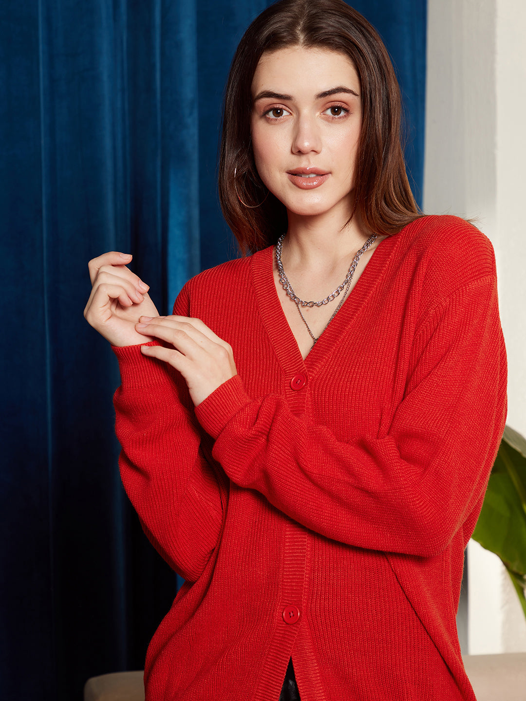 Berrylush Women Solid Red V-Neck Drop-Shoulder Sleeves Button-Up Ribbed Hem Regular Cardigan