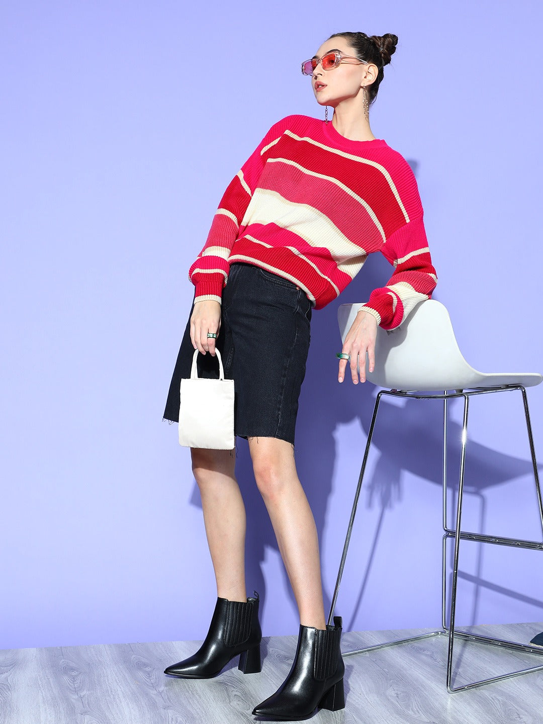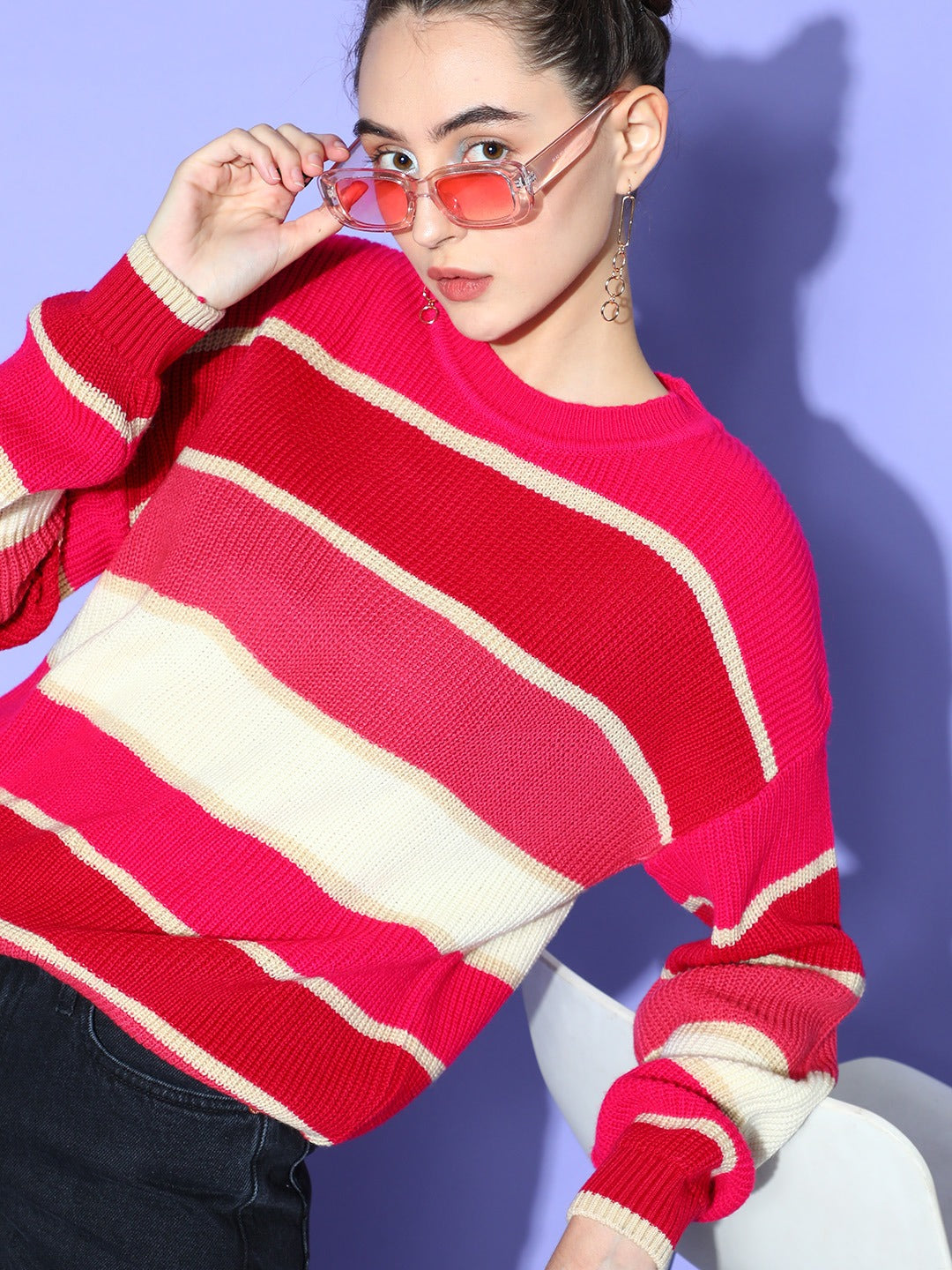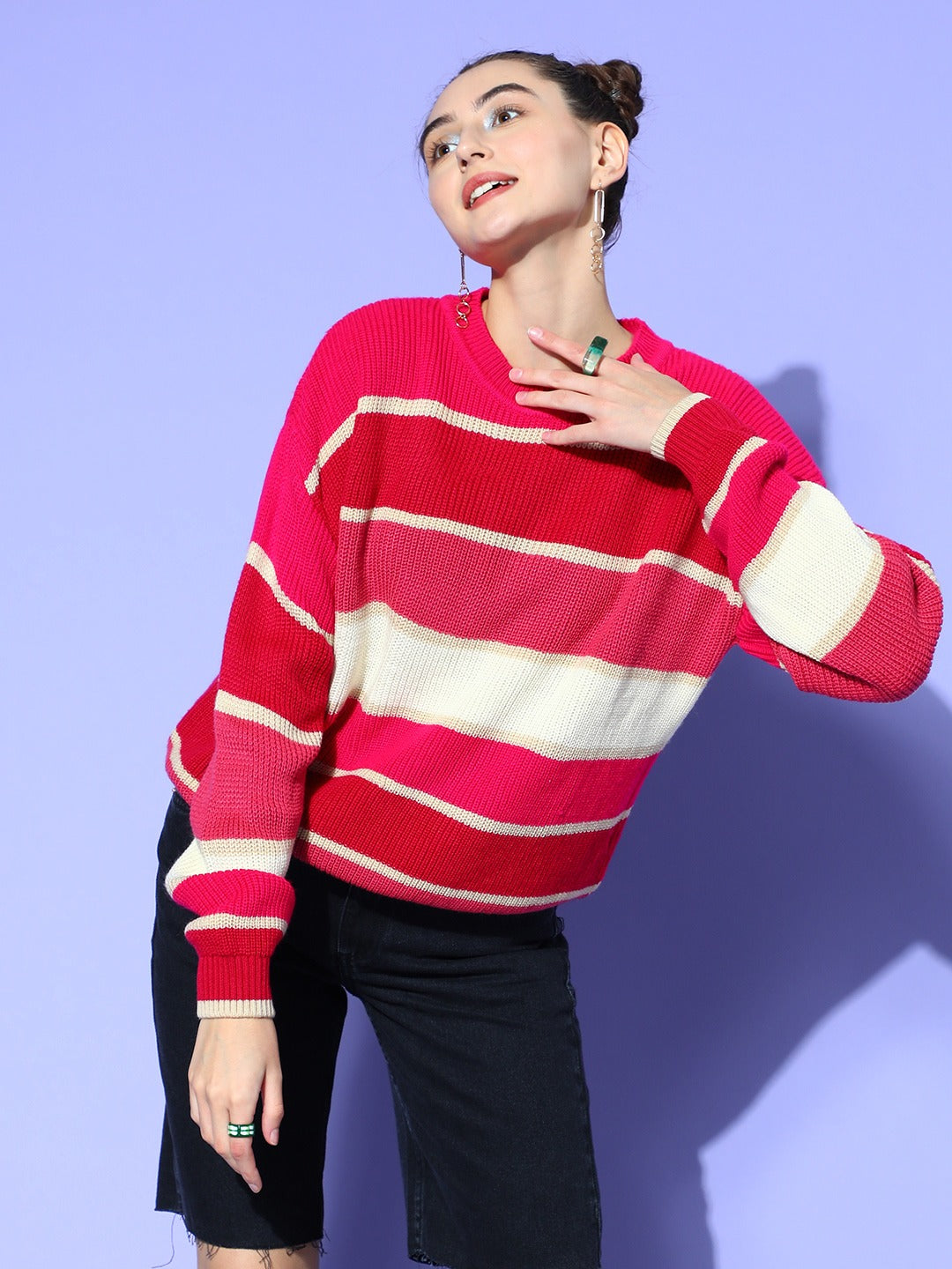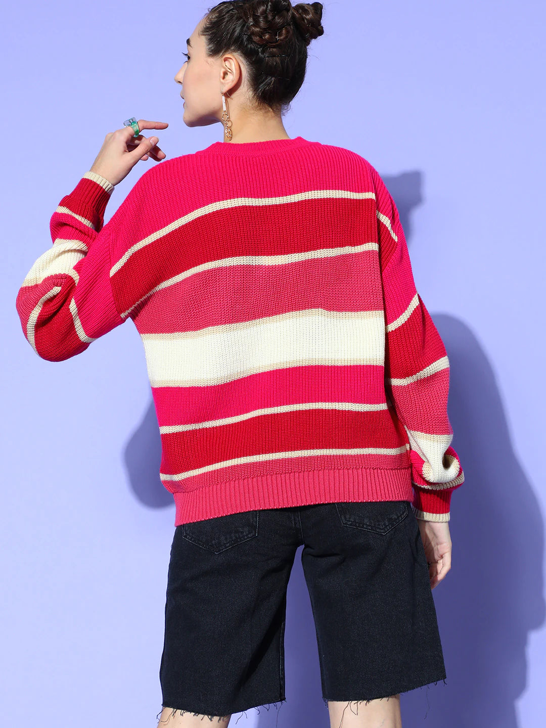 Berrylush Women Pink & Off-White Striped Print Round Neck Acrylic Ribbed Hem Pullover