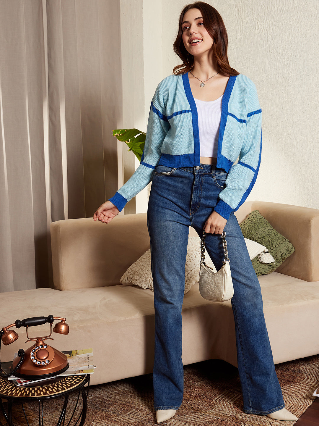 - Striped print and blue colour give this cardigan a bold and casual look