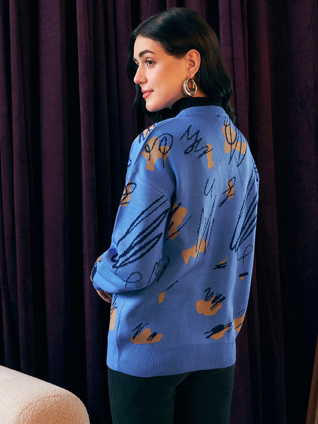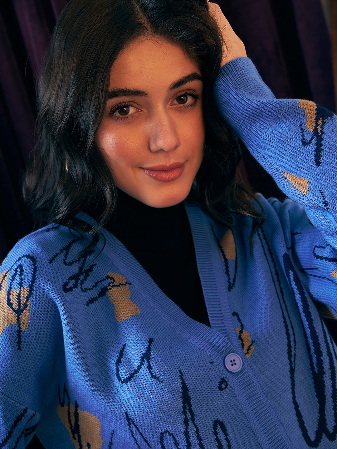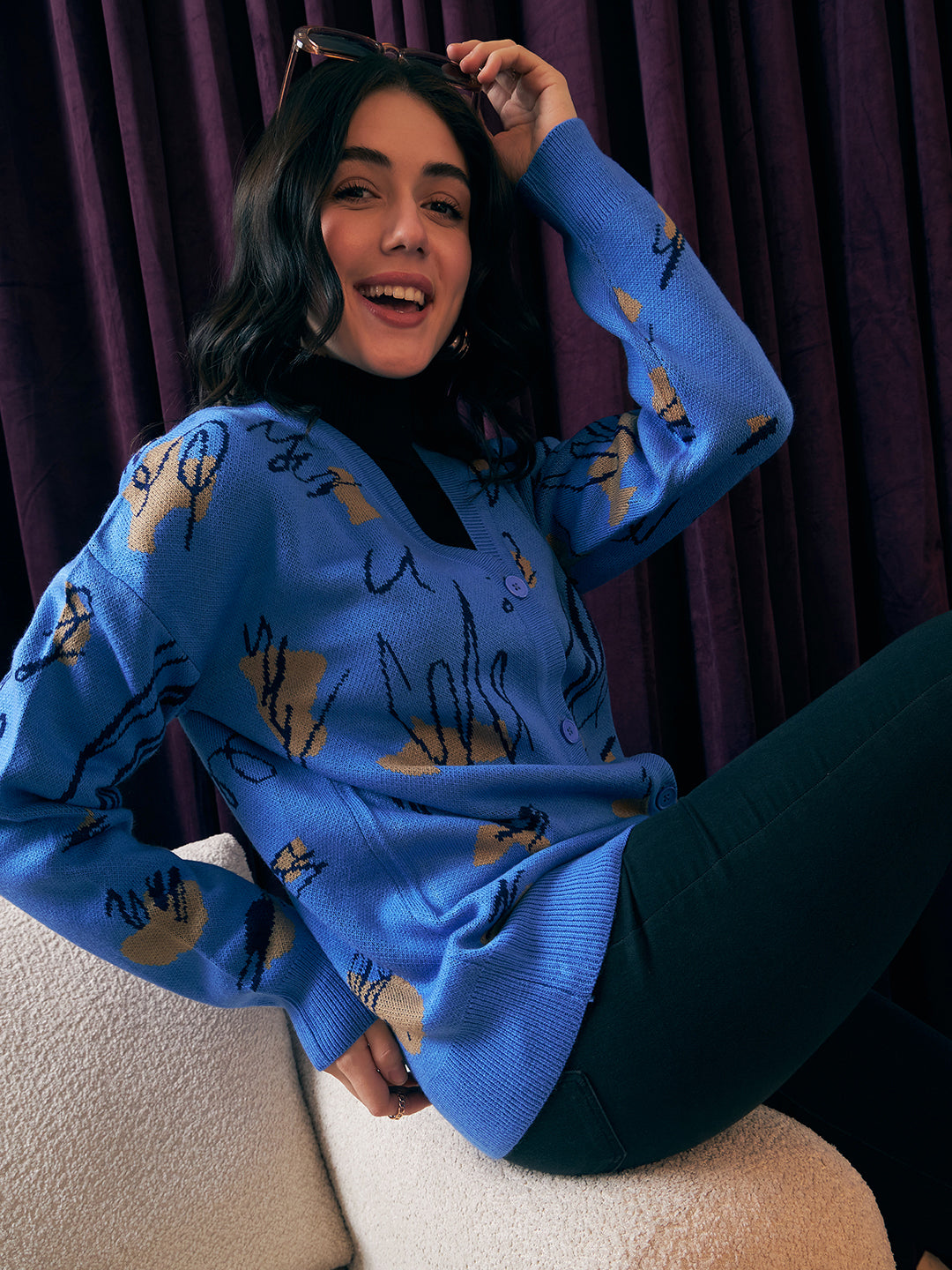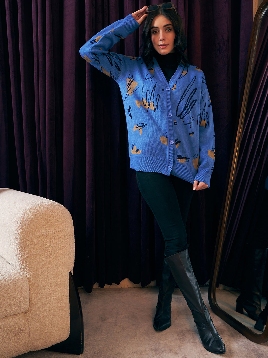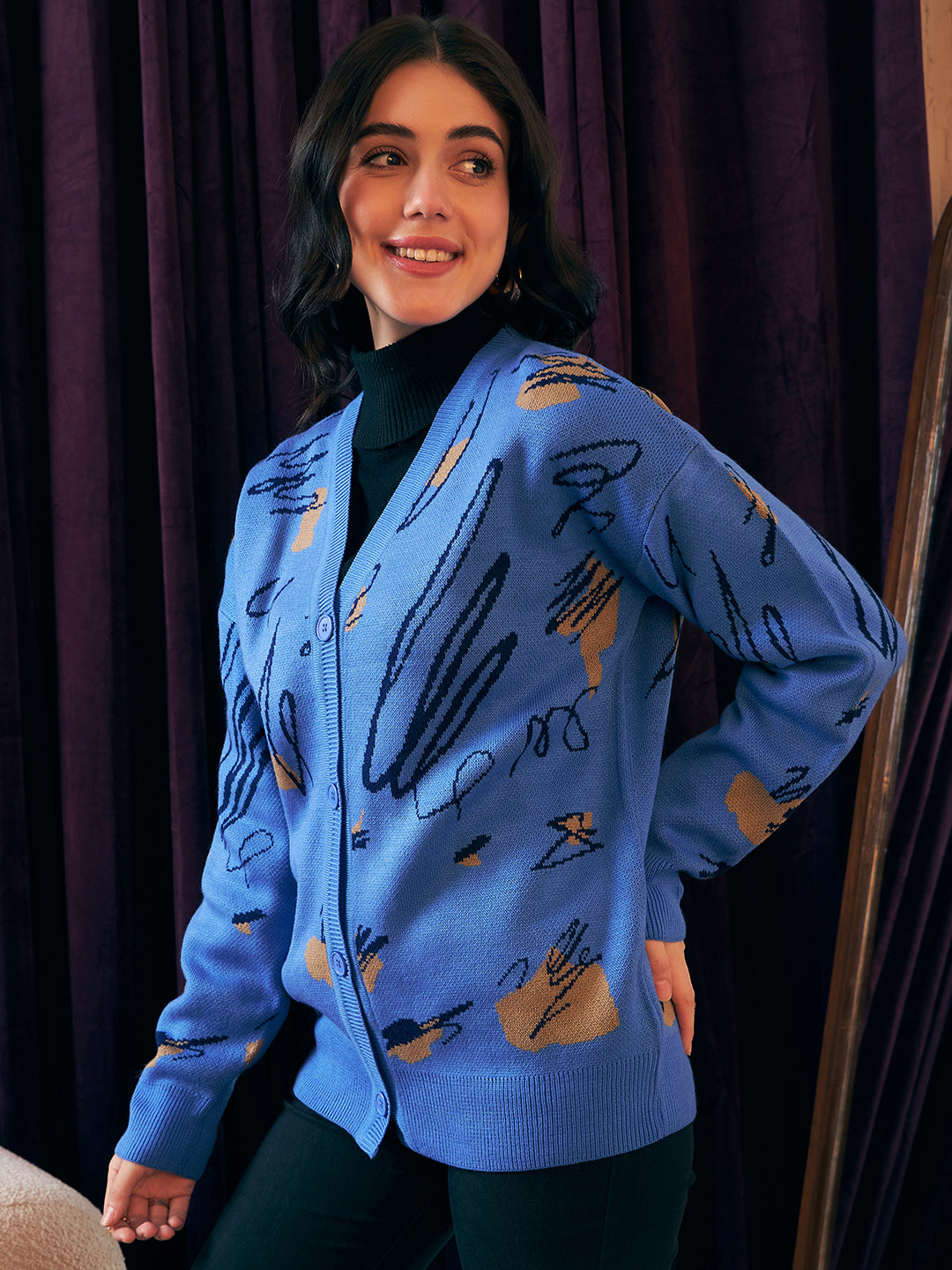 Introducing the latest addition to your wardrobe essentials from Berrylush – indulge in the perfect blend of style and comfort with our Blue & Black Graphic Printed Cardigan. Designed for those casual outings where making a statement is non-negotiable, this eye-catching piece features a striking graphic print that sets you apart. Crafted from soft, premium acrylic fabric in a knitted weave, it promises both warmth and durability. Its innovative drop-shoulder sleeves coupled with a chic V-neck elevate your outfit's charm effortlessly. The regular fit ensures versatility across occasions while the ribbed hem adds a touch of sophistication. Fastened with buttons, this opaque cardigan combines effortless fashion with functional design to create an essential layering piece that you'll reach for time and again.