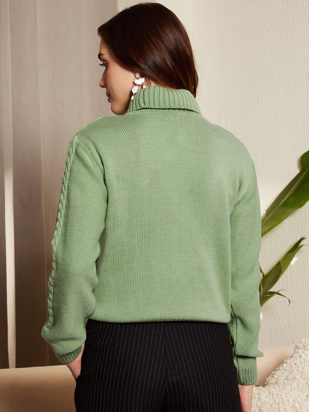 Berrylush Women Solid Light Green Turtle Neck Acrylic Ribbed Hem Cable Knitted Regular Sweater
