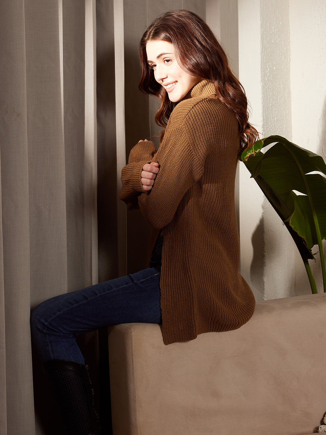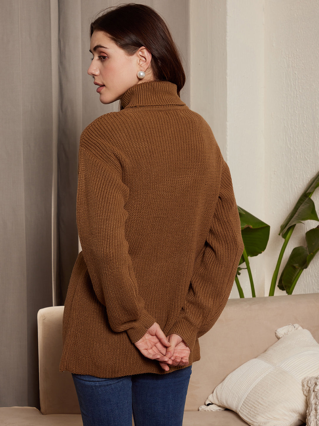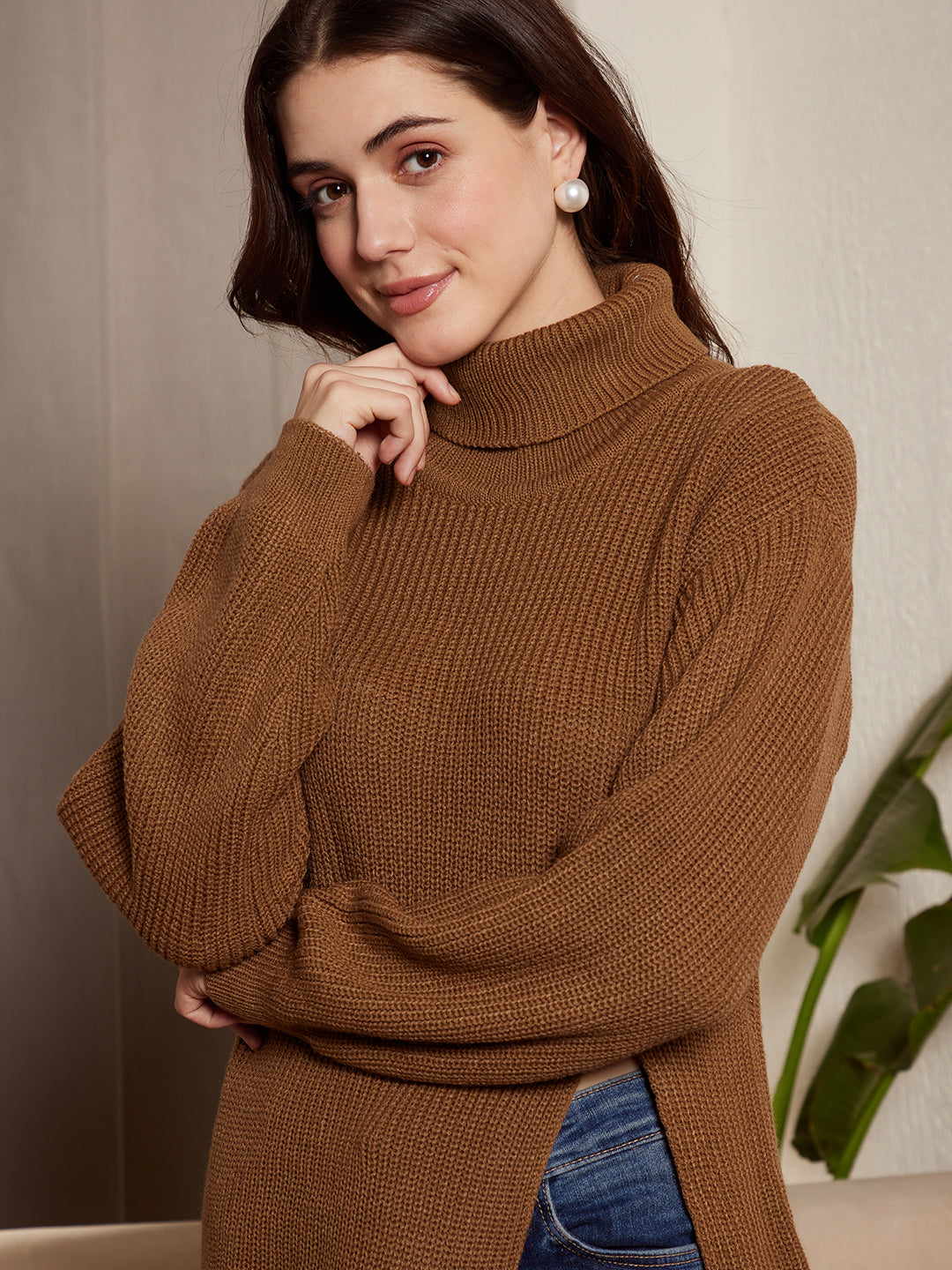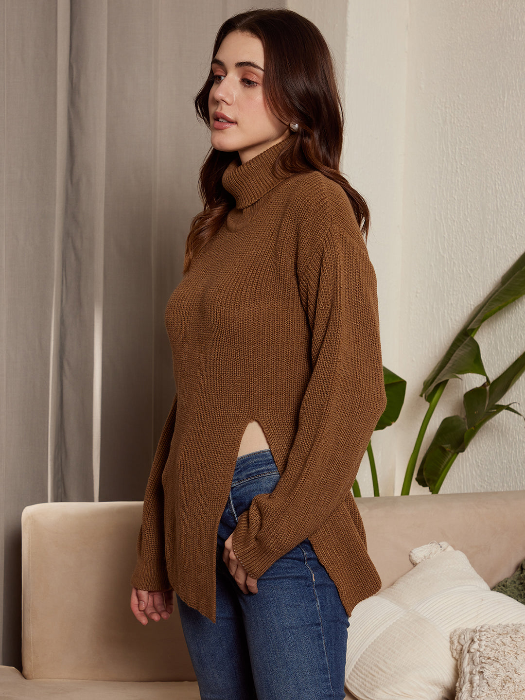 Berrylush Women Solid Brown Turtle Neck Drop-Shoulder Sleeves Straight Hem Slitted Regular Sweater