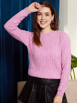 Berrylush Women Solid Pink Round Neck Drop-Shoulder Sleeves Acrylic Ribbed Hem Cable Knitted Regular Sweater