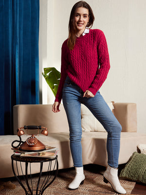Berrylush Women Solid Red Round Neck Drop-Shoulder Sleeves Acrylic Ribbed Hem Cable Knitted Regular Sweater