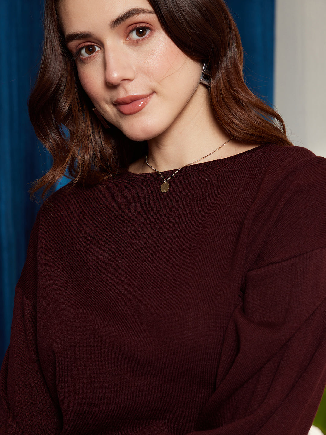 Berrylush Women Solid Maroon Round Neck Drop-Shoulder Sleeves Acrylic Straight Hem Knitted Regular Top & Midi Skirt Sweater Co-Ord Set