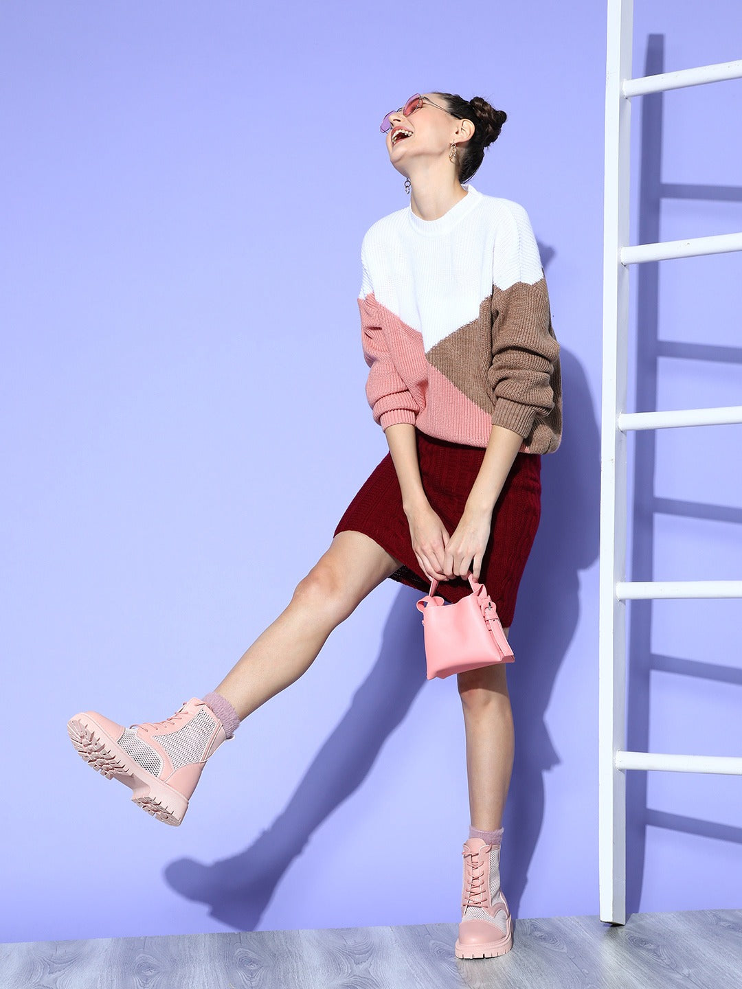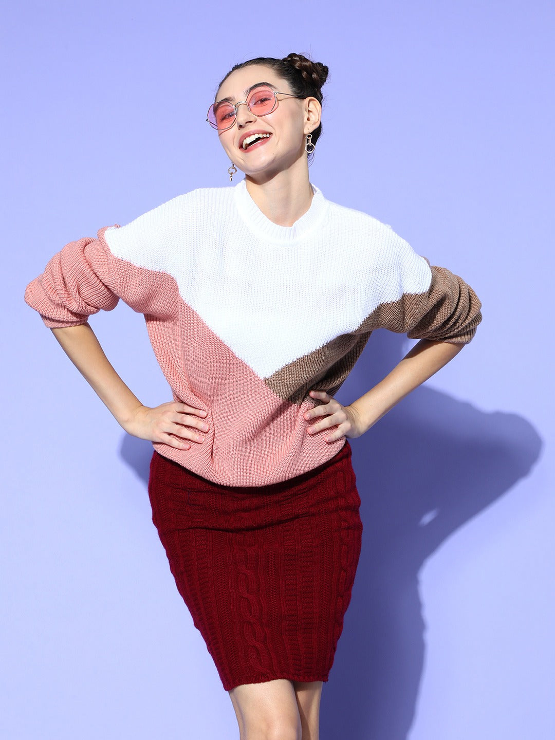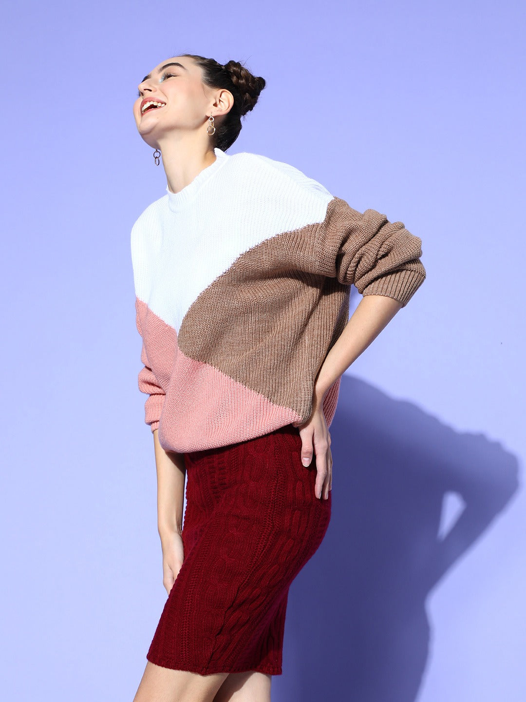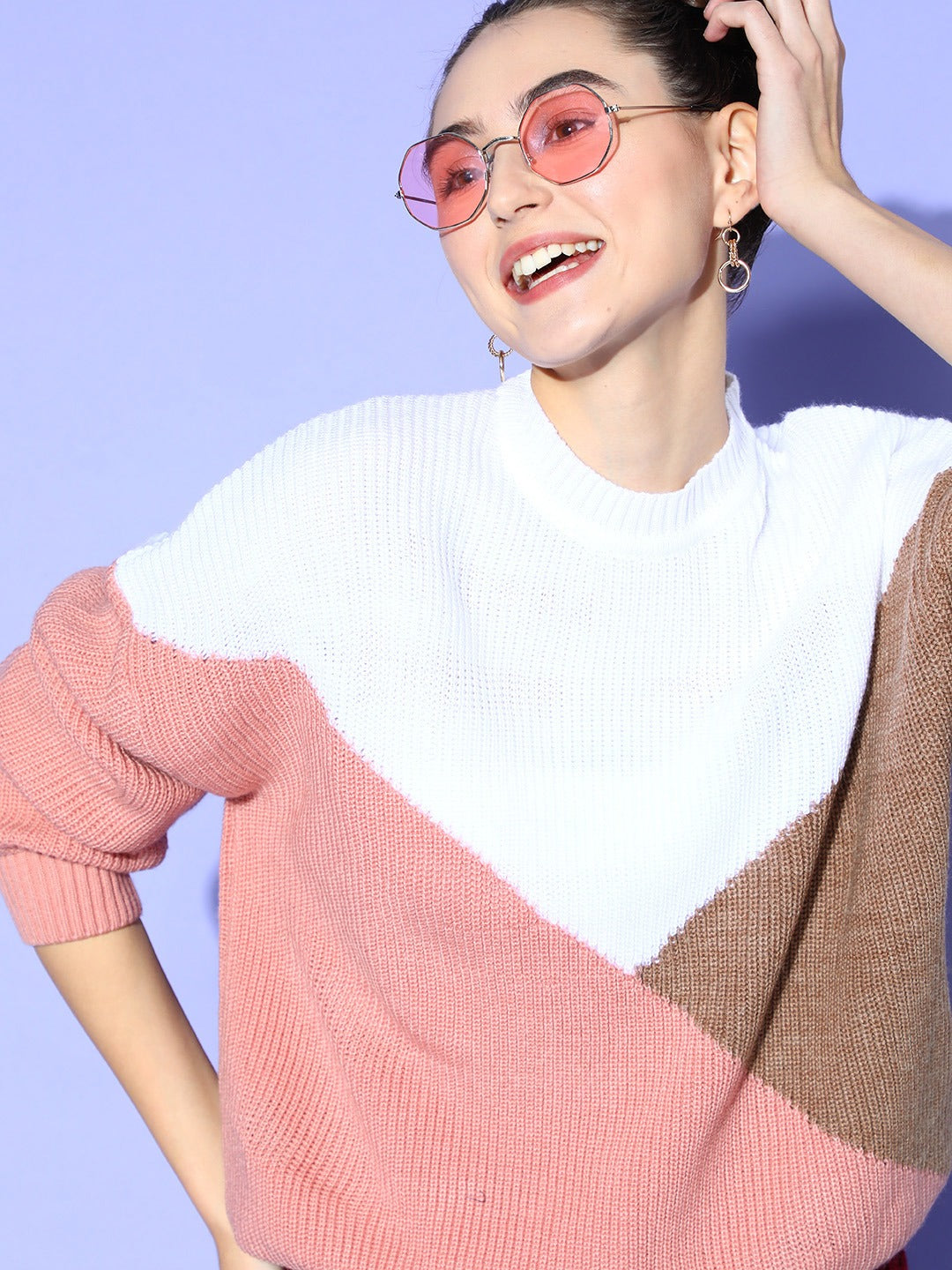 Dress up in the most elegant and eye-popping hues this winter season by beautifully donning this captivating White and Brown Colourblocked Pullover from Berrylush. Tailored in the ribbed hemline to give this pullover a pretty small pleats design along with a contouring silhouette to retain heat. Presenting pullover style to support ease wearing attribute with a clean and refined finish. Moreover, the regular length makes this pullover appear sophisticated with a practical fashion statement. Go on an evening movie date looking fabulous by wearing this pullover with a mini skirt, a pair of pink shoes, diamond earrings, pink sunglasses, and a cute pink handbag.