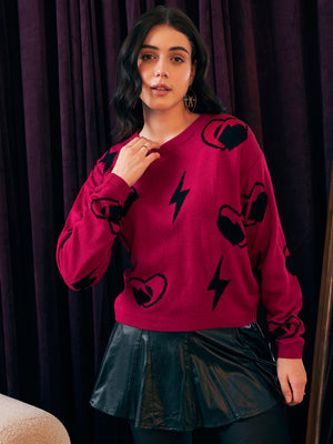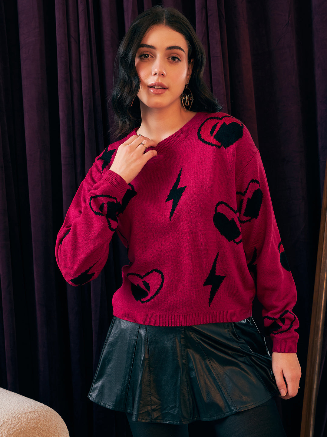 Berrylush Women Pink & Black Graphic Printed Round Neck Drop-Shoulder Sleeves Acrylic Ribbed Hem Knitted Regular Sweater