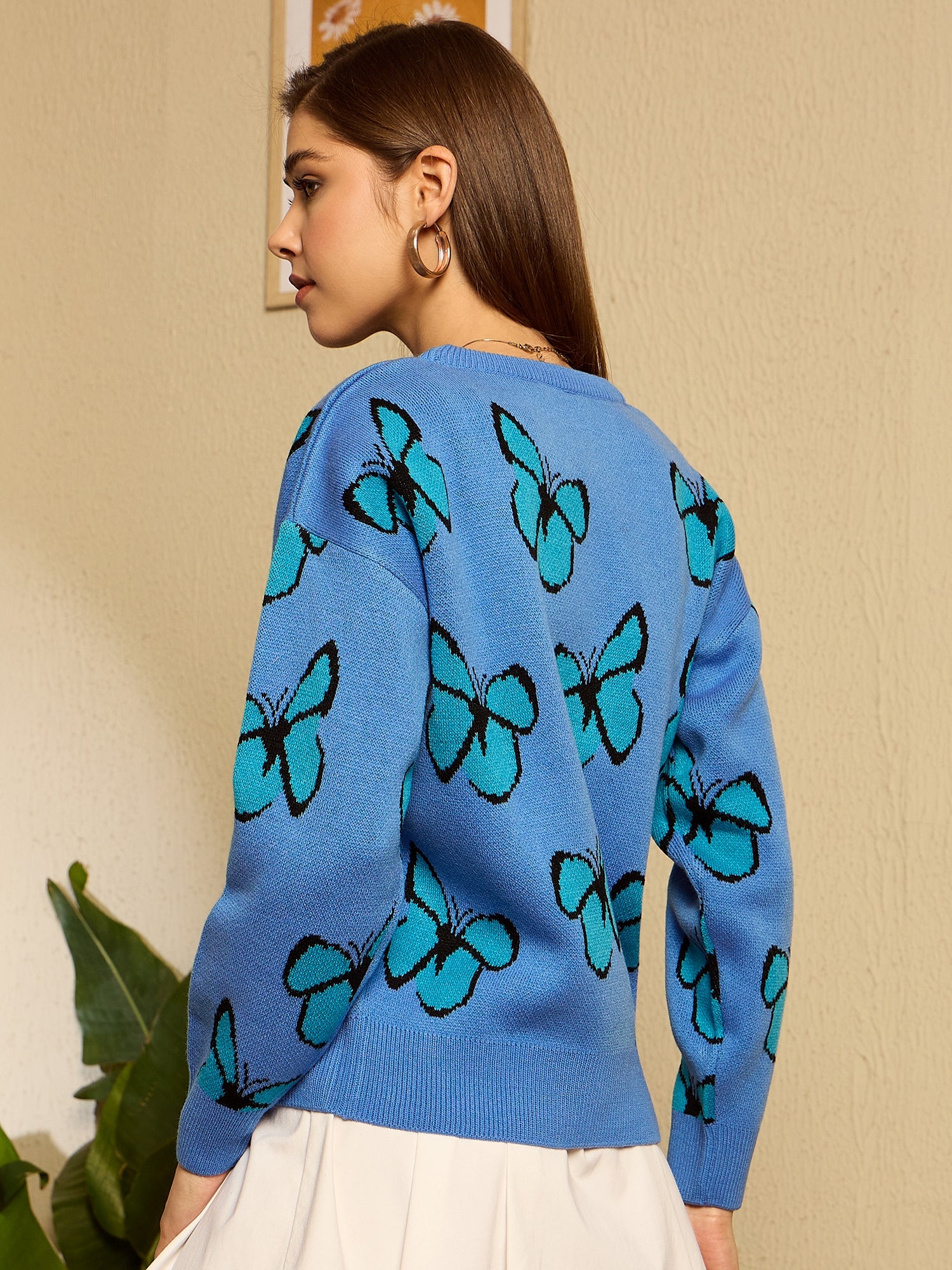 Berrylush Women Blue & Black Butterfly Printed Round Neck Drop-Shoulder Sleeves Acrylic Ribbed Hem Regular Pullover