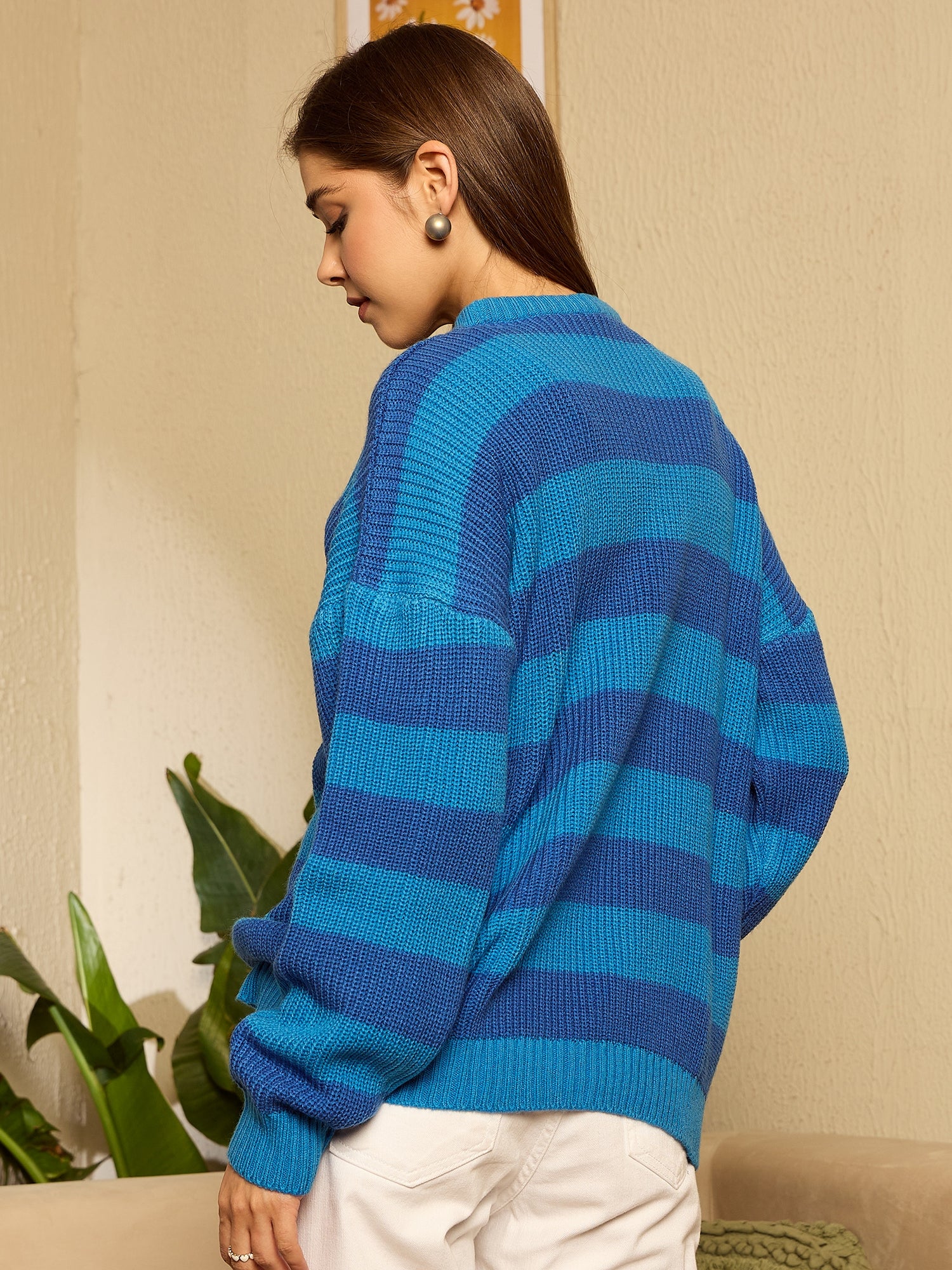 Berrylush Women Blue Striped Print Round Neck Drop-Shoulder Sleeves Acrylic Ribbed Hem Regular Pullover