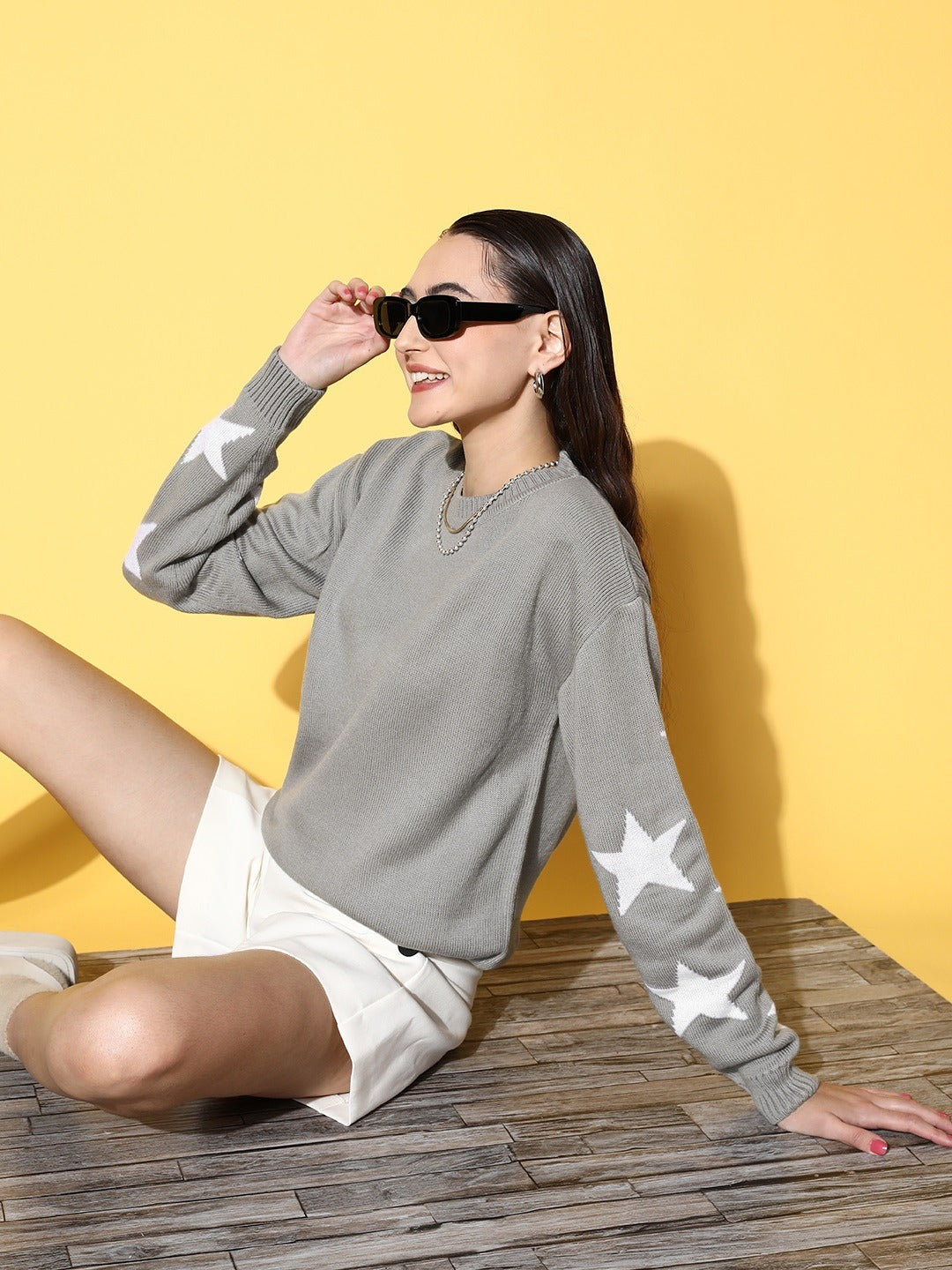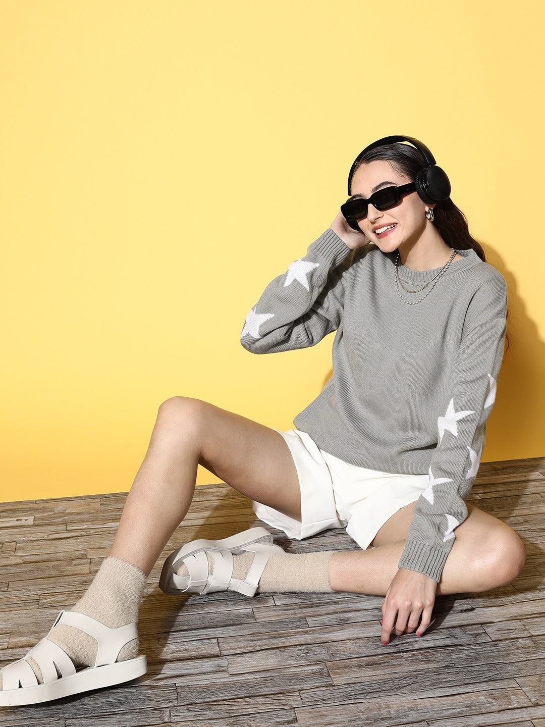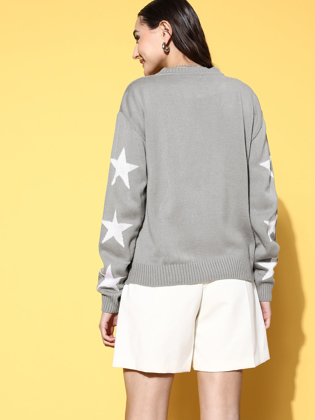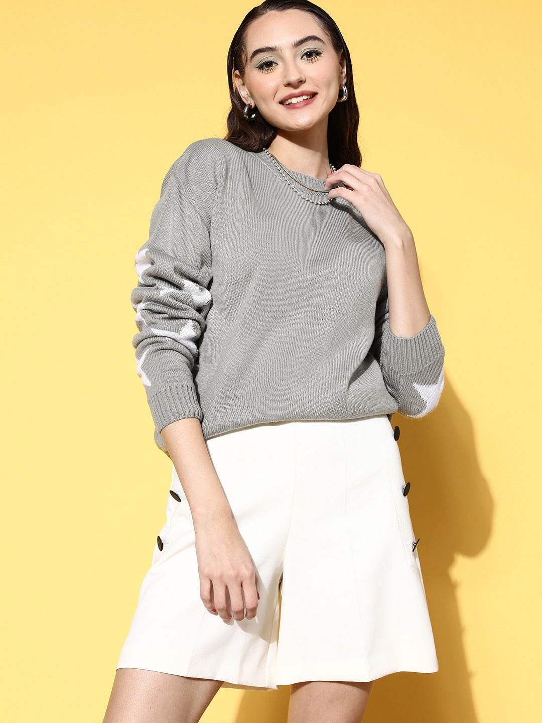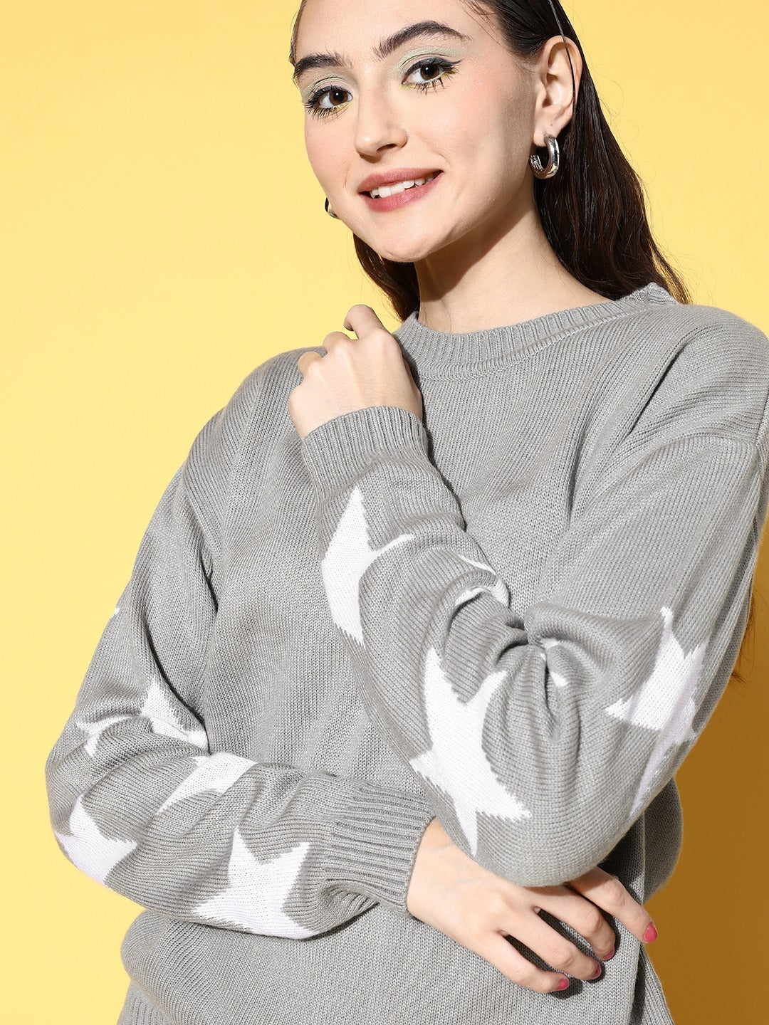 Berrylush Women Grey Geometric Printed Round Neck Acrylic Straight Hem Pullover