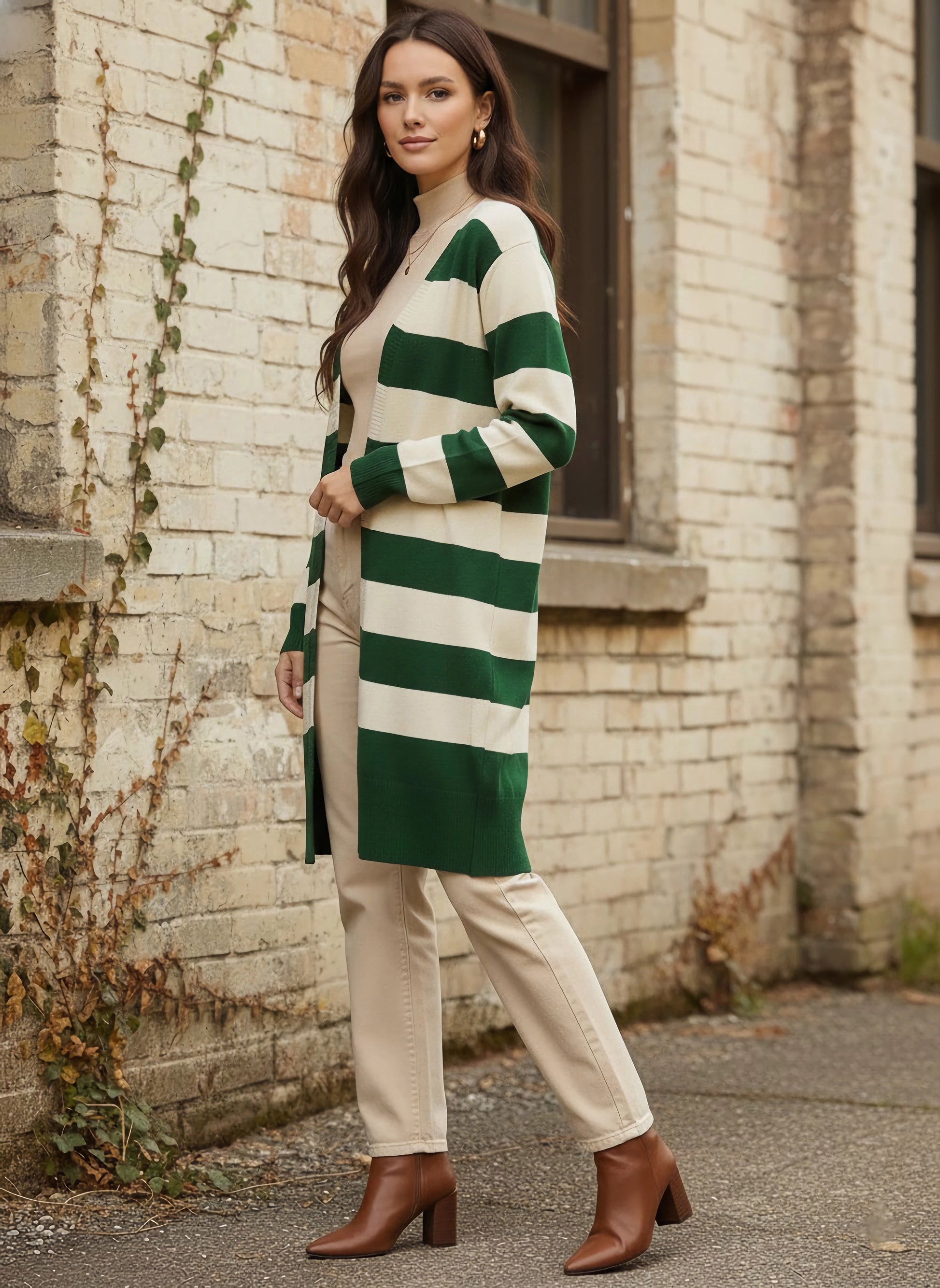 Wrap yourself in effortless style with the Berrylush Green & White Striped Print V-Neck Drop-Shoulder Sleeves Open-Front Acrylic Longline Cardigan. This chic cardigan effortlessly marries comfort and modern design, making it an essential piece for any laid-back occasion. Crafted from soft acrylic fabric, it offers a cosy fit that you'll love to layer over your favourite outfits. Featuring a playful striped pattern and a relaxed drop-shoulder sleeve design, this longline cardigan flatters every silhouette while embracing versatility. The eye-catching V-neck adds just the right amount of flair to your ensemble, ensuring you stand out without compromising on ease. With its straight hemline and opaque weave that provides both warmth and coverage, this piece is perfect for transitioning between seasons or simply keeping cosy during chilly days at home.