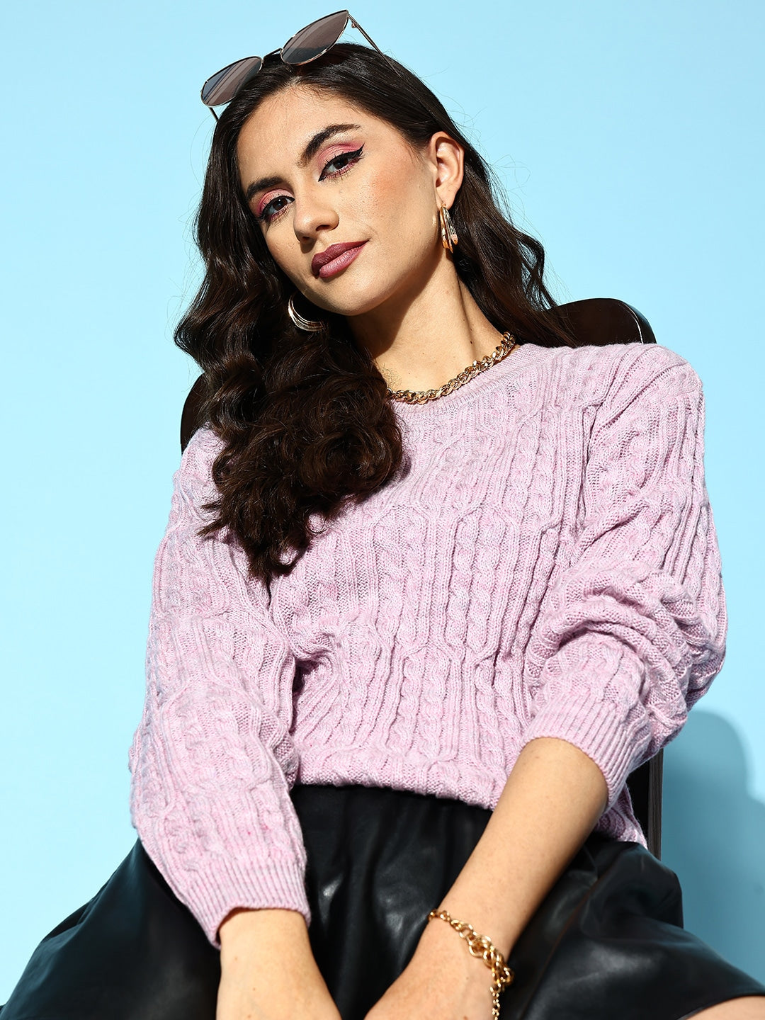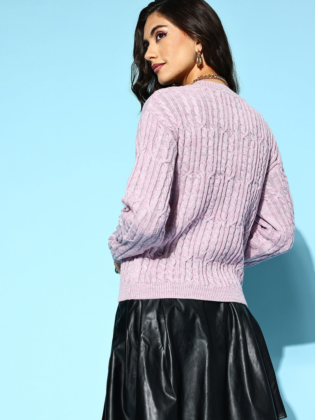Berrylush Women Purple Cable Knitted Pattern Round Neck Acrylic Ribbed Hem Pullover