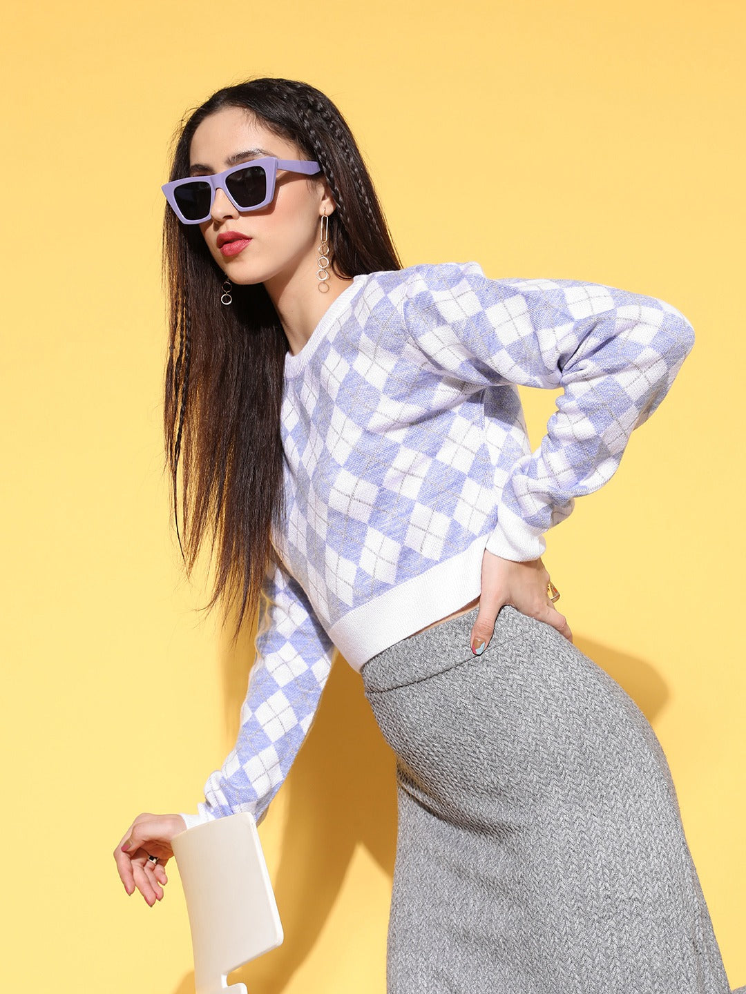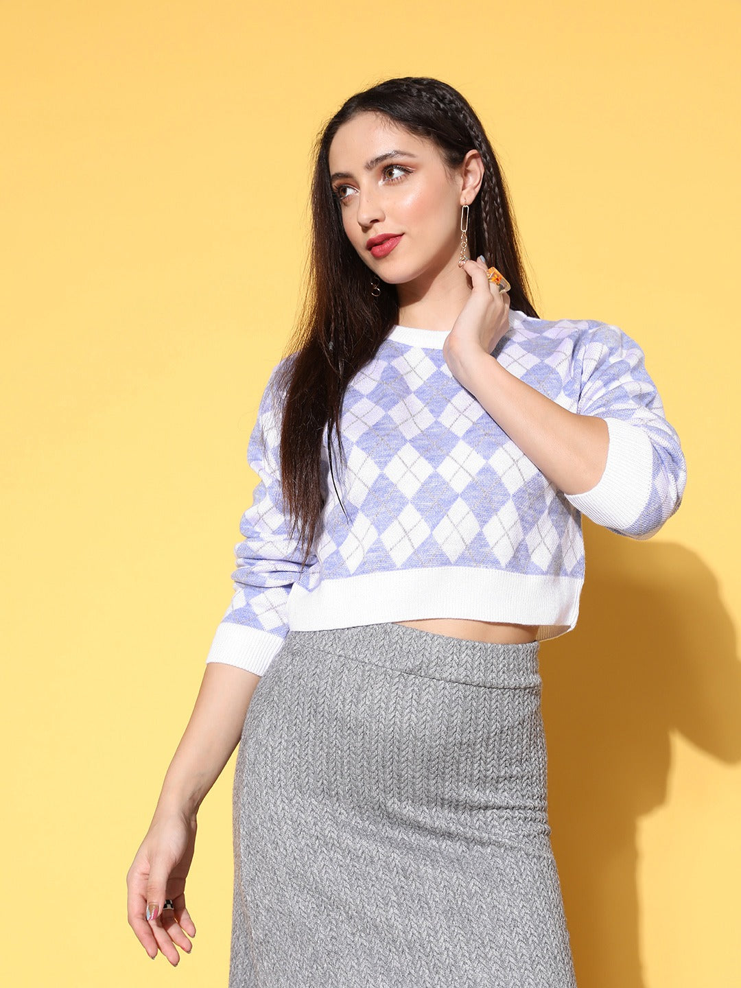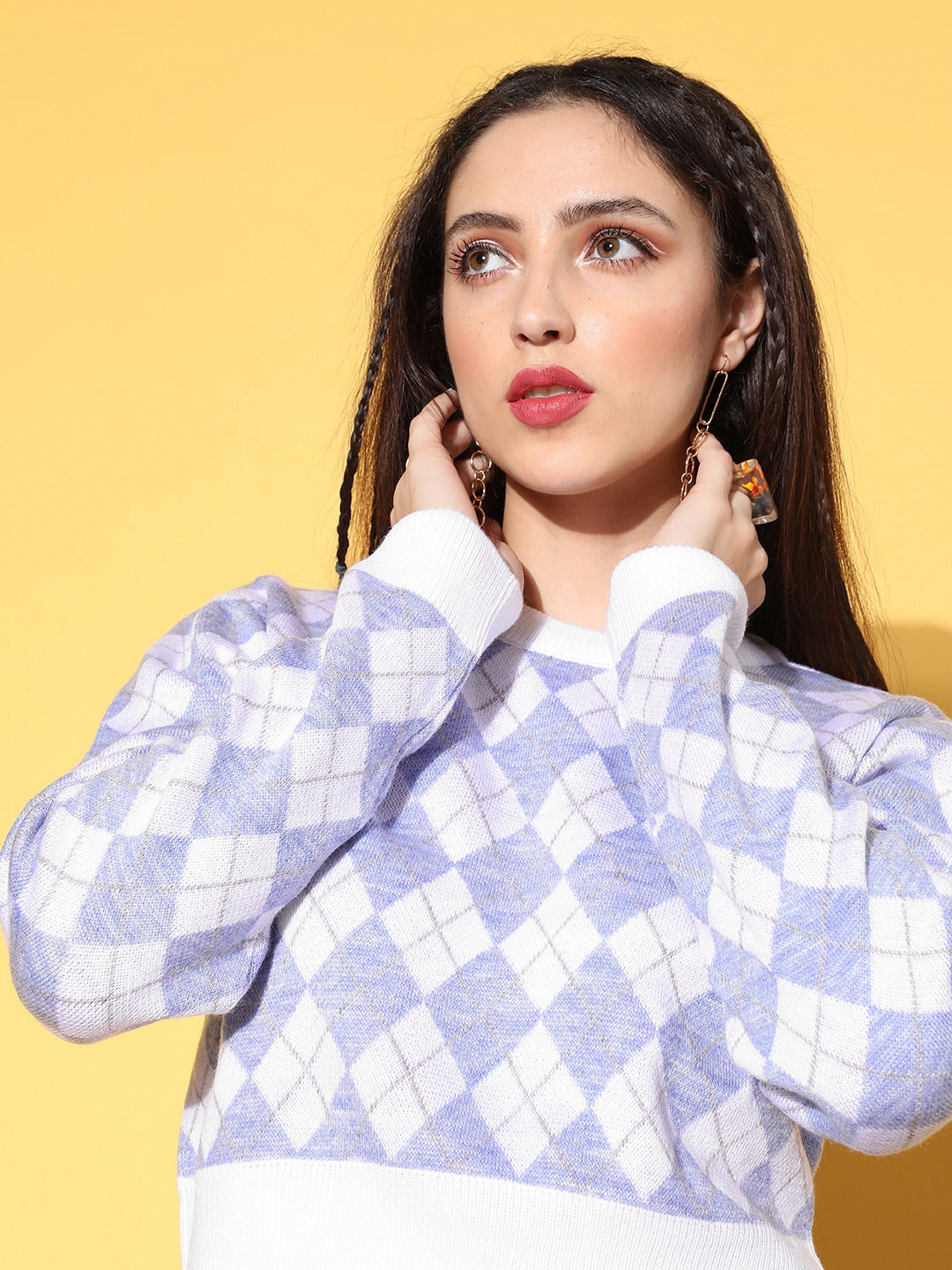 Berrylush Women White & Blue Argyle Pattern Round Neck Acrylic Ribbed Hem Regular Pullover