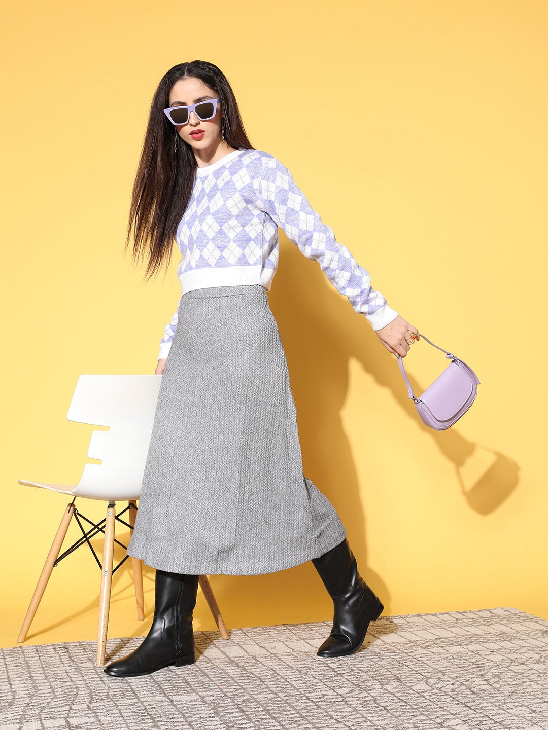 Take on a classy style even during the colder climates by investing in this astonishing Argyle White and Blue Round Neck Ribbed Regular Pullover introduced by Berrylush. Showing off long-regular sleeves that offer your arms an attractive coverage to keep them warm and cosy for a prolonged duration. Detailed with an argyle pattern that assembles an overlapping diamond design which enhances the chic appearance of this pullover. The pullover design simplifies the fastening process with easy to pull-on and off feature. Wear this pullover with your favourite skirt, a pair of high-heels, silver tassel earrings, and a cute purple side bag to get a charismatic look for your next casual plan.