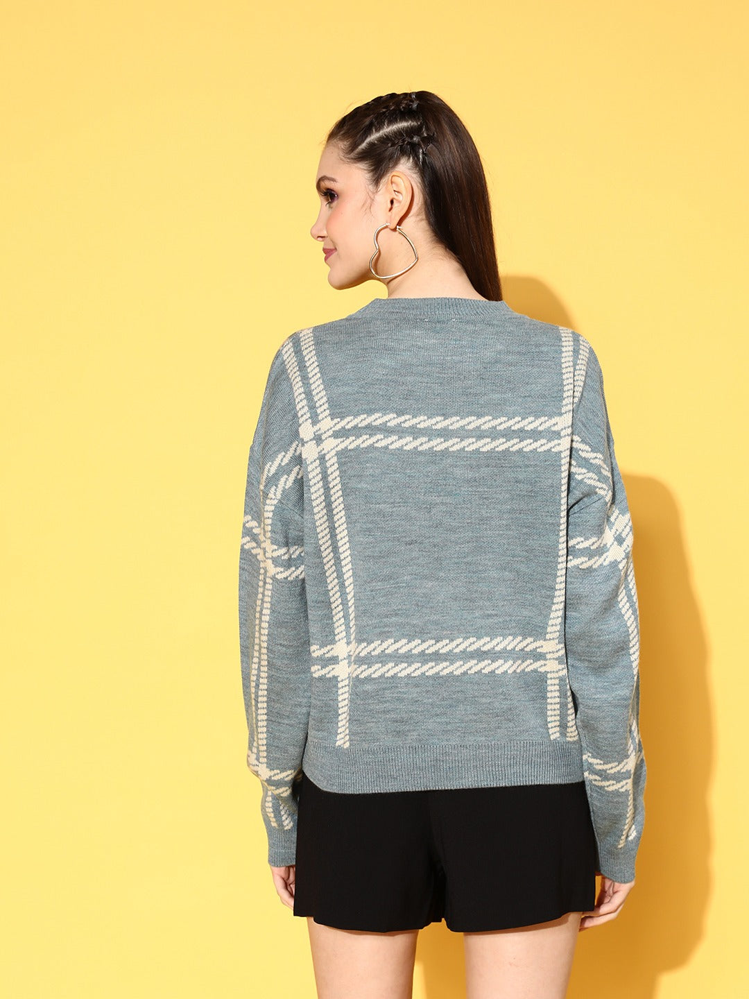 Embody classy and voguish charm in your casual wardrobe with the addition of this beautiful Blue and Beige Checked Round Neck Ribbed Regular Pullover designed by Berrylush. Created in a lightweight composition from lightweight acrylic fabric that lends this pullover absolute resistance from wrinkles and fading after every wash. Adorned in a ribbed hemline that gives this pullover a snugly fit to elegantly outshine your natural curves with a comfy feel. Moreover, the regular length gives this pullover a practical design that offers you a sophisticated appearance. Walk out of home looking boho-chic by wearing this pullover with a black mini skirt, black loafers, heart shape earrings, and a trendy waist bag.