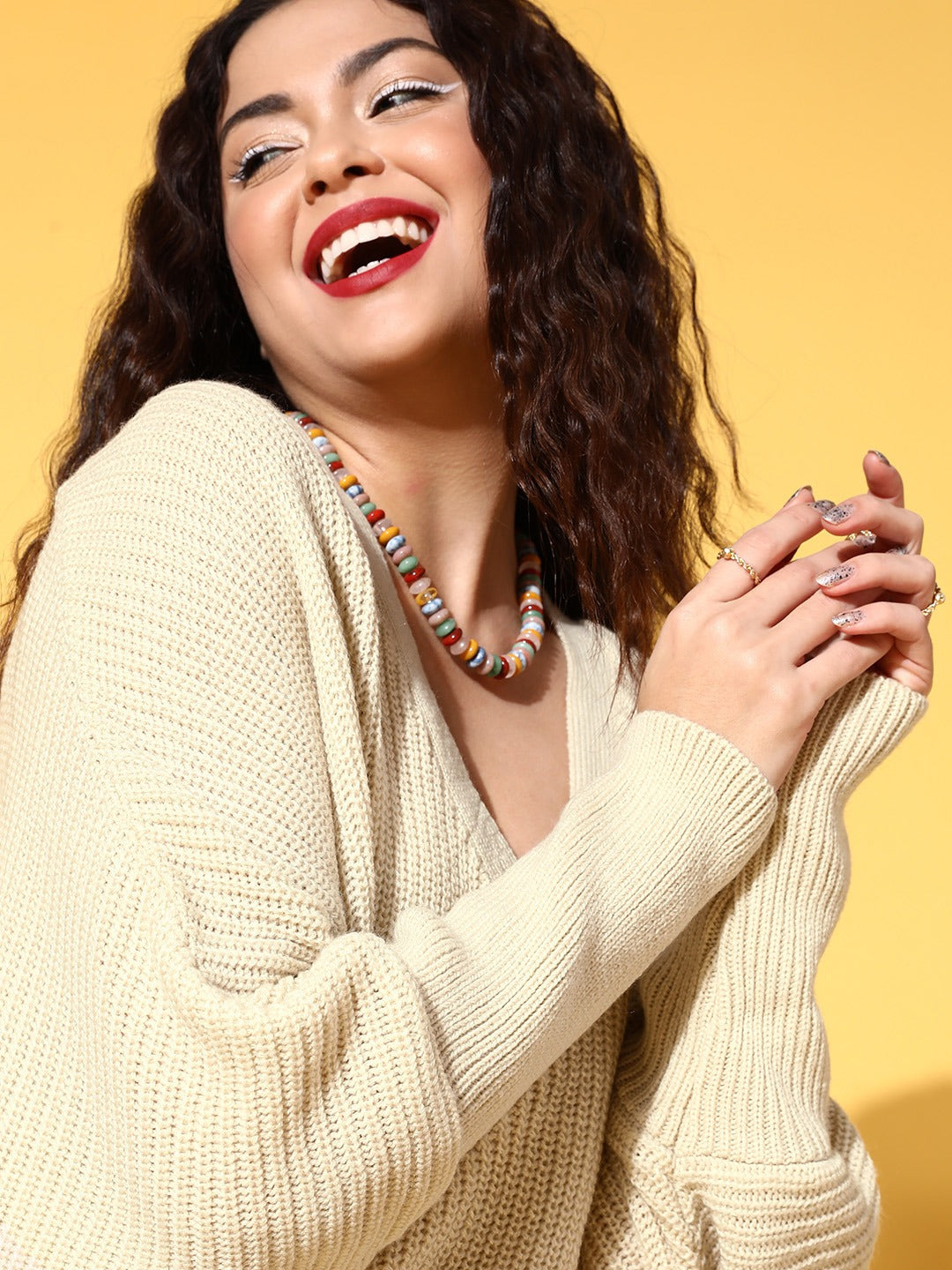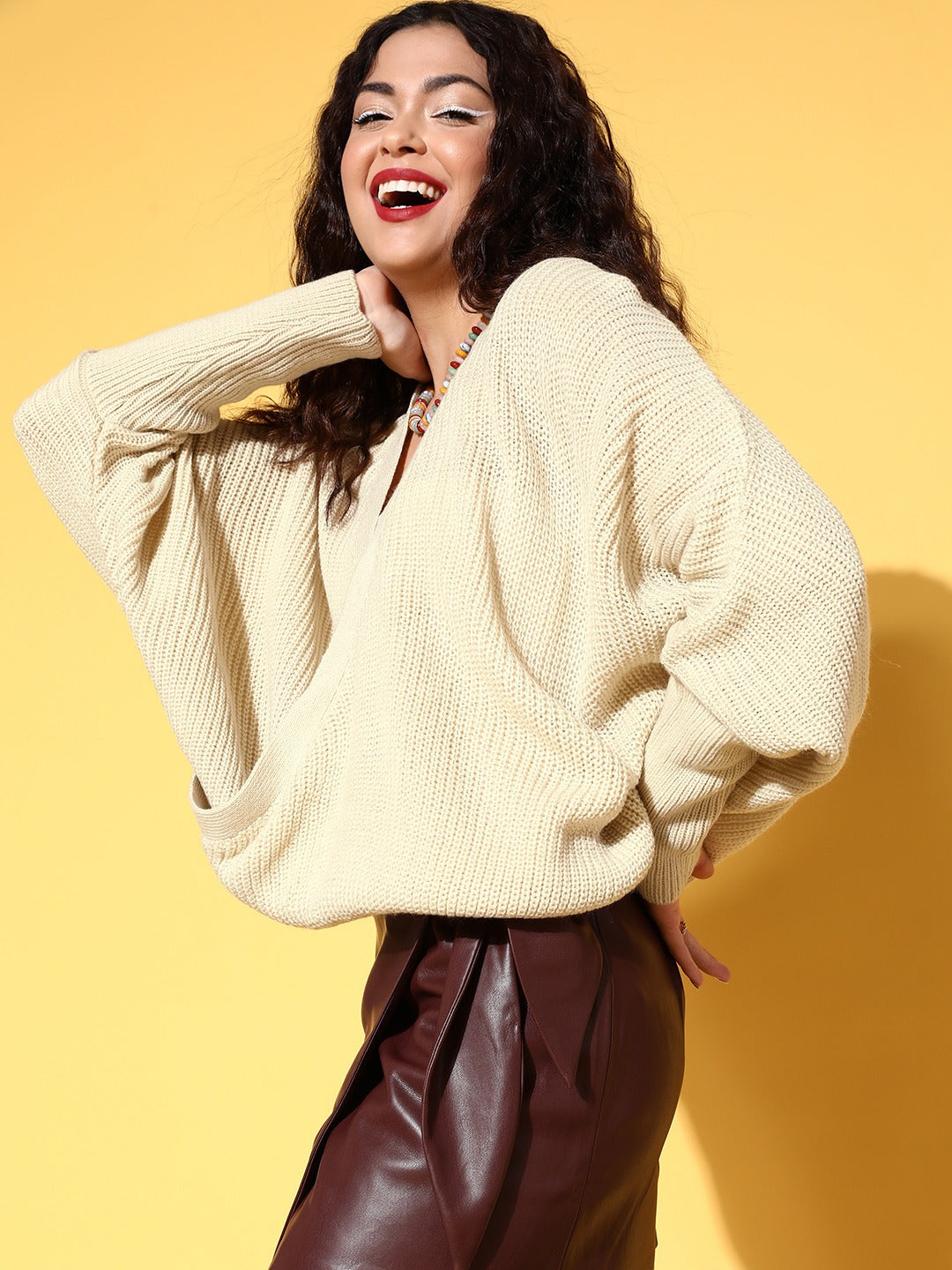 Berrylush Women Solid Beige V-Neck Acrylic Ribbed Hem Pullover Sweater