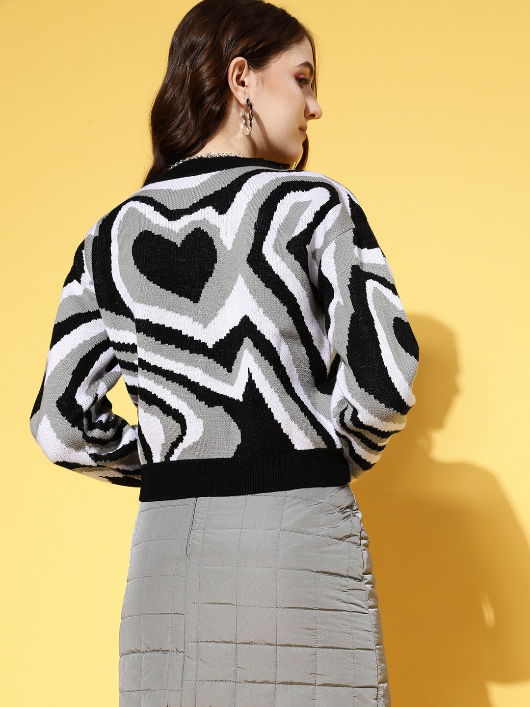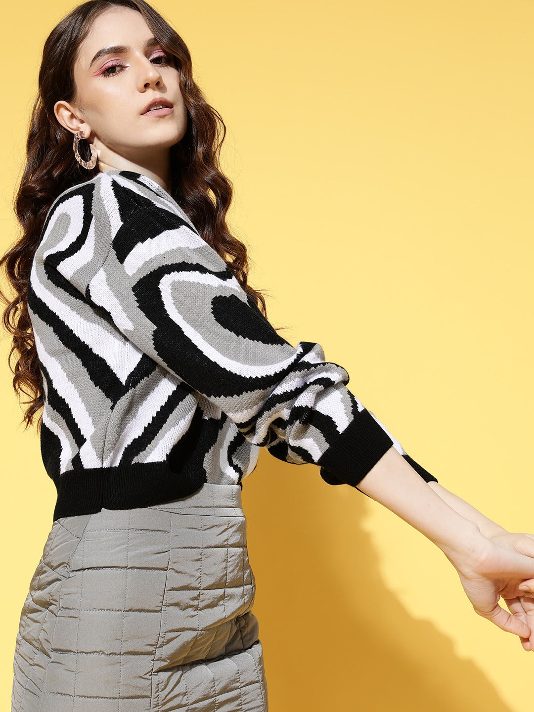 Berrylush Women Grey, Black, & White Abstract Printed Round Neck Acrylic Ribbed Hem Pullover