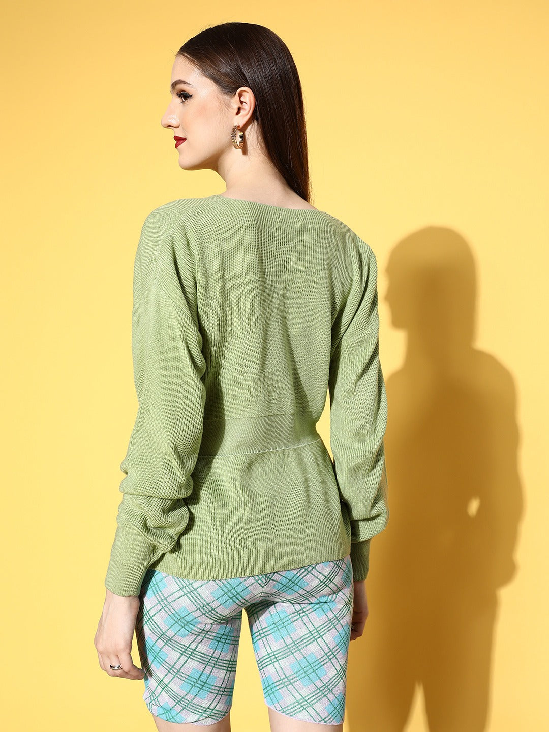 Dress with the best this autumn season with a style that is elegant and sassy in the meantime just like this chic Solid Green Drop-Shoulder Sleeves Pullover from Berrylush. Beautifully designed with a V-neck that lends this pullover a breathable definition with an edgy appeal to your neckline. Fashioned with long sleeves that give your arms full coverage to keep them warm with a modest style note. In addition, the regular fit makes this pullover a suitable layering option with a comfy feel. You can wear this pullover with your favourite shorts or trousers accompanied by ankle-length boots, classy diamond earrings, and a trendy-side bag to create a fashion-focused look.