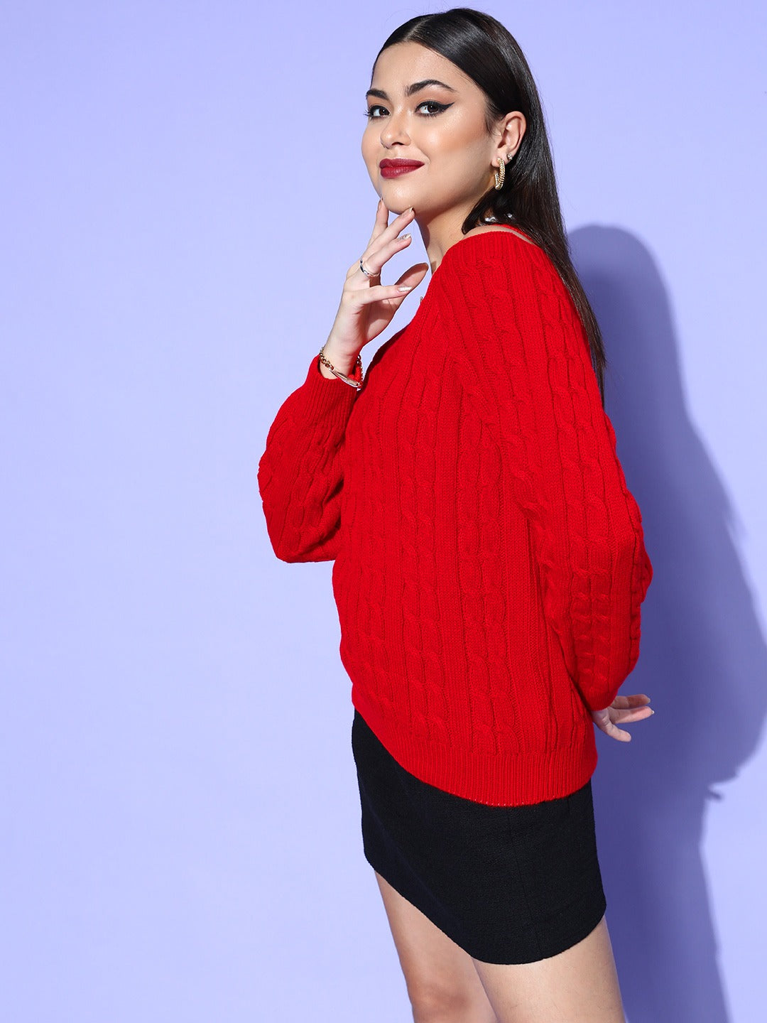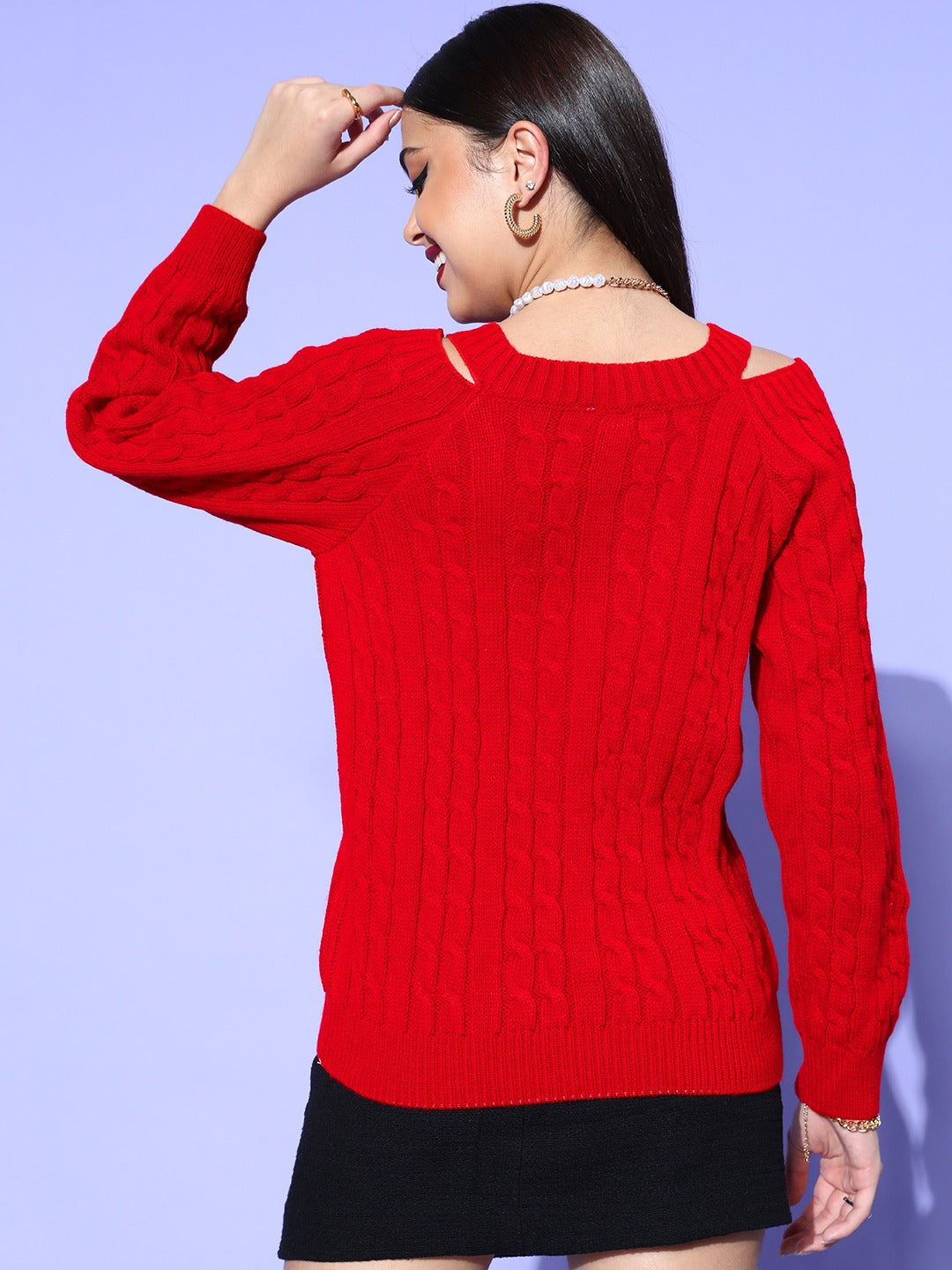 Berrylush Women Red Cable Knitted Pattern V-Neck Cutout Acrylic Ribbed Hem Regular Pullover