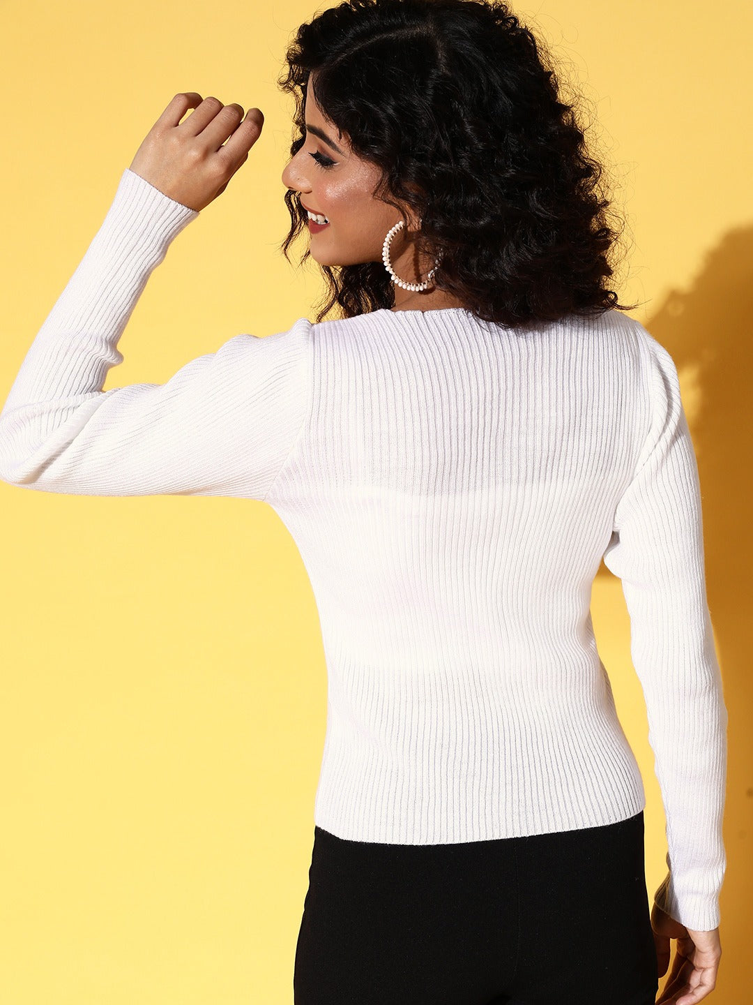 Give your winter closet a voguish and trendy update with this gorgeous Solid White Scoop Neck Knitted Acrylic Rib Hem Regular Pullover introduced by Berrylush. Styled with a pullover design to make this sweater easy to wear without consuming much time along with a smart outer appearance. Presenting a beautiful amalgam of white shade and solid pattern that put together a classic design giving away a pleasing vibe. The ribbed hemline lends this sweater an edgy and seamless appeal with a hint of elasticity. Partner up this pullover sweater over black parallel pants, a pair of high-heels, and your favourite handbag to get a glamorous look.