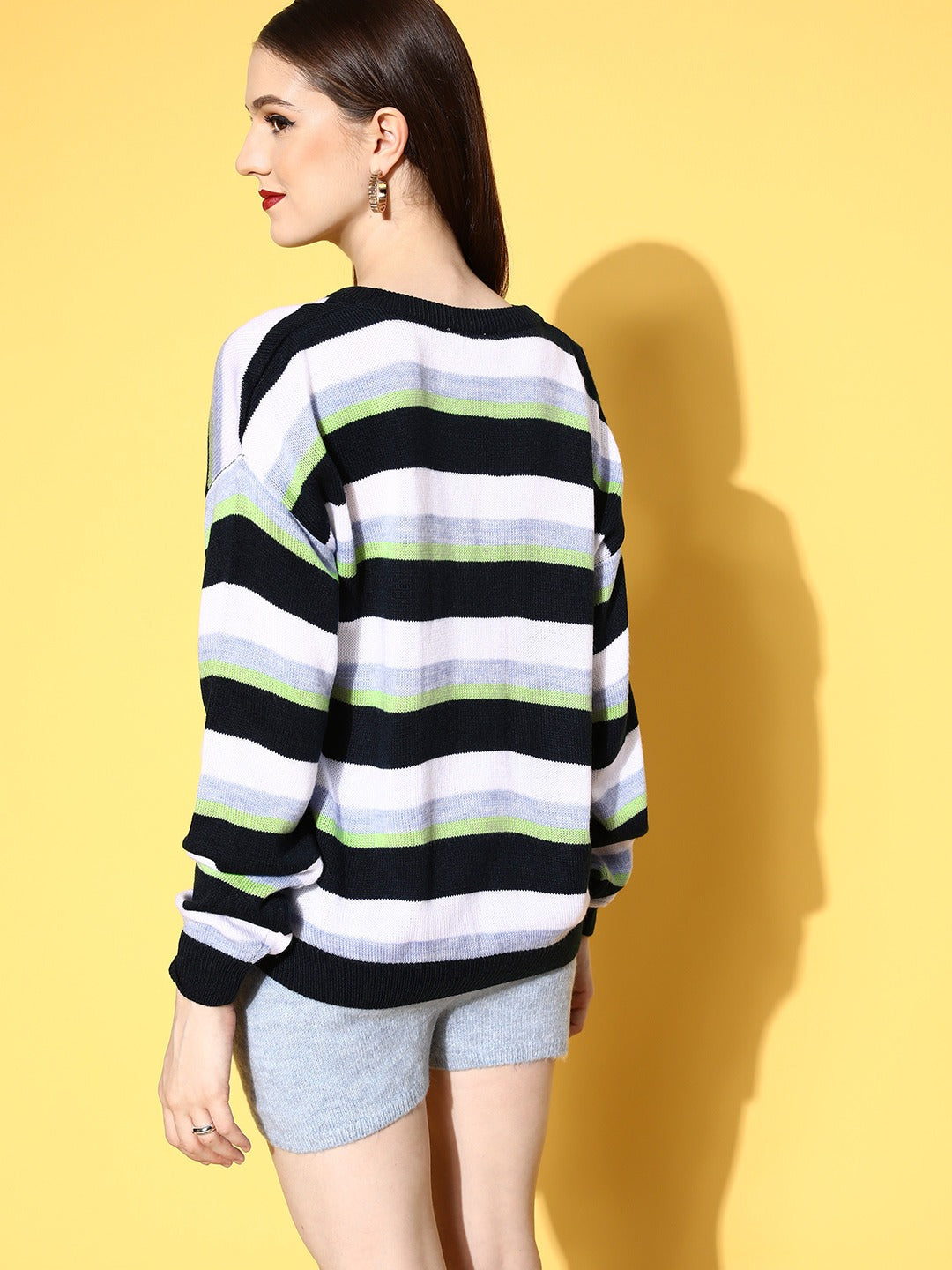 Berrylush Women Multicolour Striped Pattern V-Neck Acrylic Straight Hem Pullover Sweater
