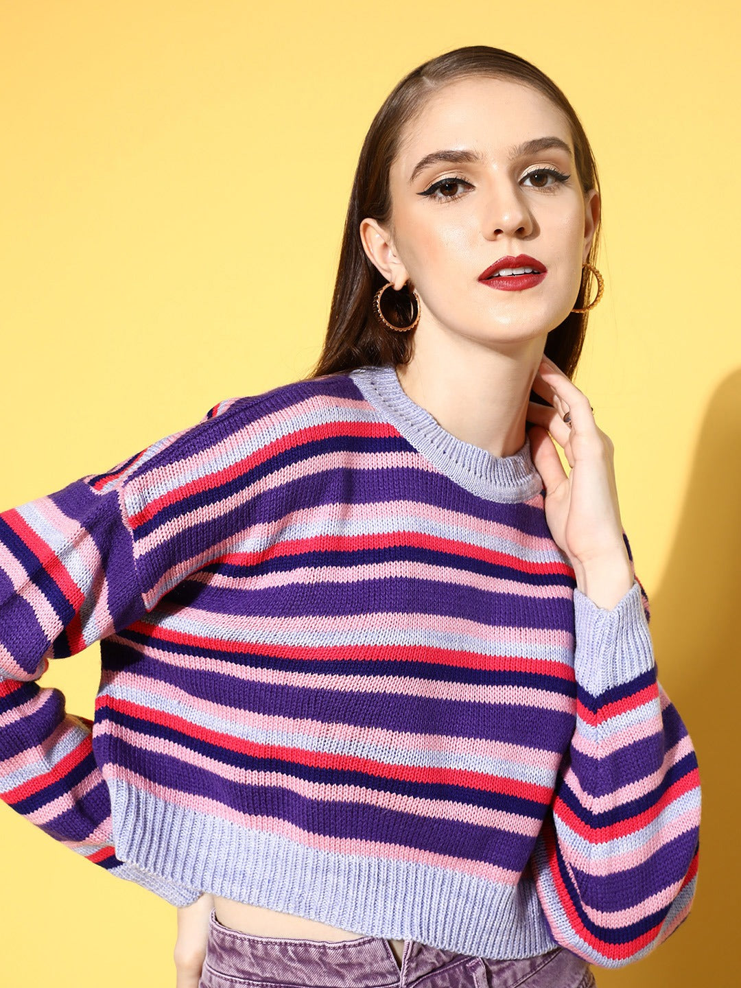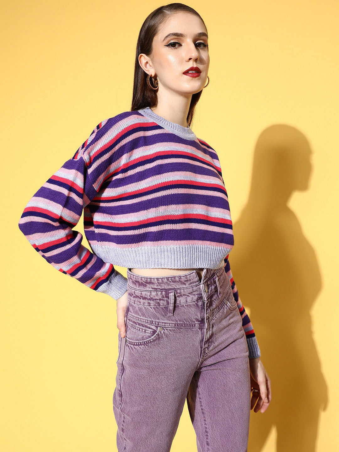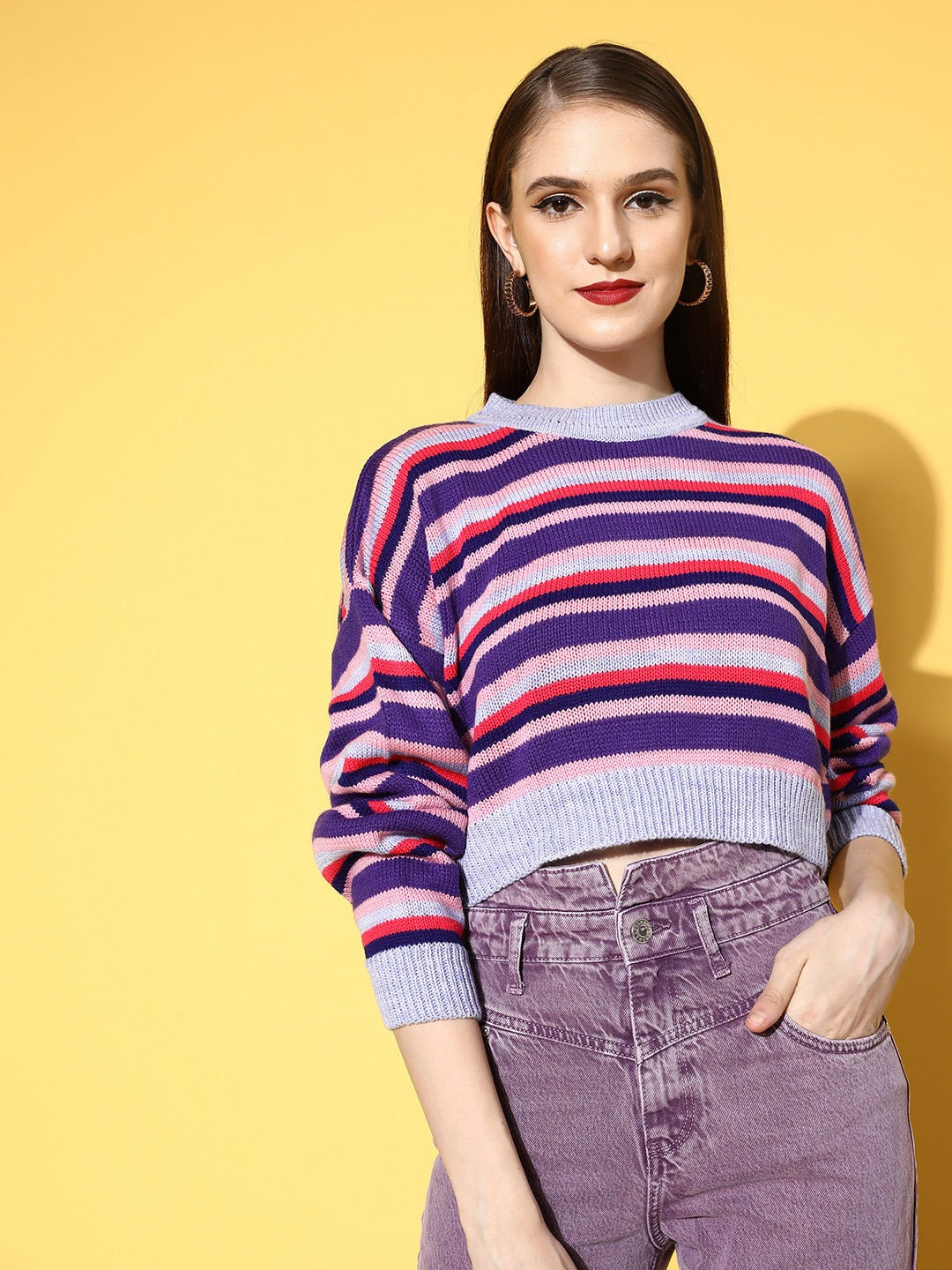 Combat the cold weather by layering yourself with flattering statement pieces like this stunning Striped Crop Pullover from the exclusive winter wear collection of Berrylush. Designed with long-regular sleeves that lend this pullover a practical style element to keep you warm and cosy all day long. Spun from the finest acrylic fabric to keep this pullover breathable with excellent resistance from wrinkles and fading. In addition, this pullover is styled with a regular fit to give you an elegant appeal without any discomfort or irritation feel. Pair up this cropped pullover over high-waist jeans with cool sneakers, purple earrings, and a matching side bag to create an athleisure look for taking a stroll.